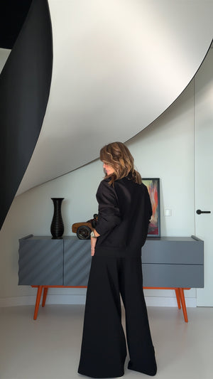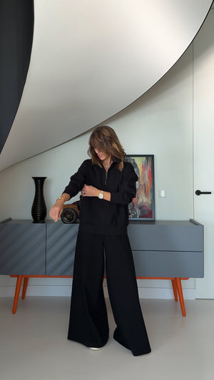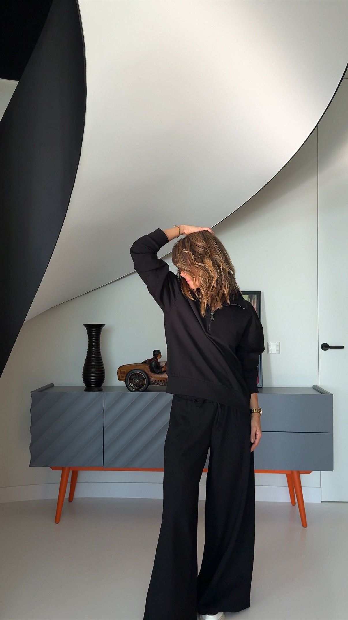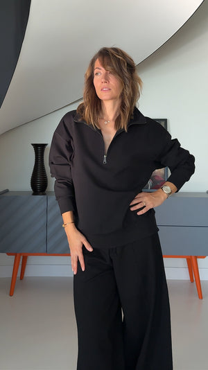 This black sweatshirt is all about comfort and effortless style. A high zippered collar and ribbed cuffs adds just the right amount of cozy. Great for layering or wearing on its own. Combination with the relaxed wide-leg pants with an elastic waistband make it perfect for those easy-going days.