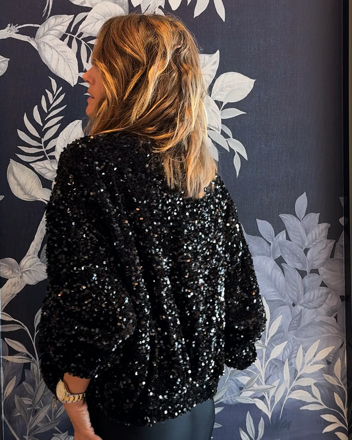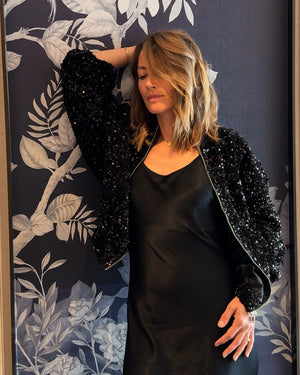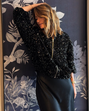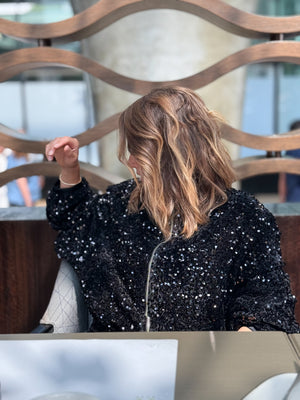 Black sequin bomber jacket is the perfect statement piece to elevate any outfit. The shimmering sequins catch the light beautifully, adding a touch of elegance and boldness to your look. Whether you’re dressing up for an evening out or adding flair to a casual outfit, this jacket will make you shine effortlessly.
