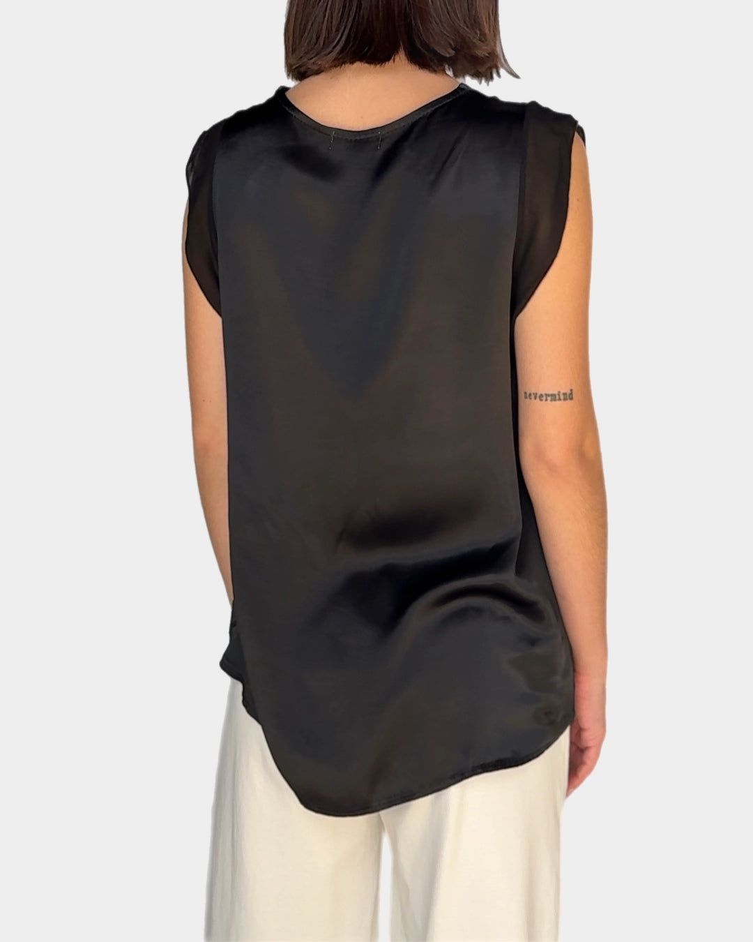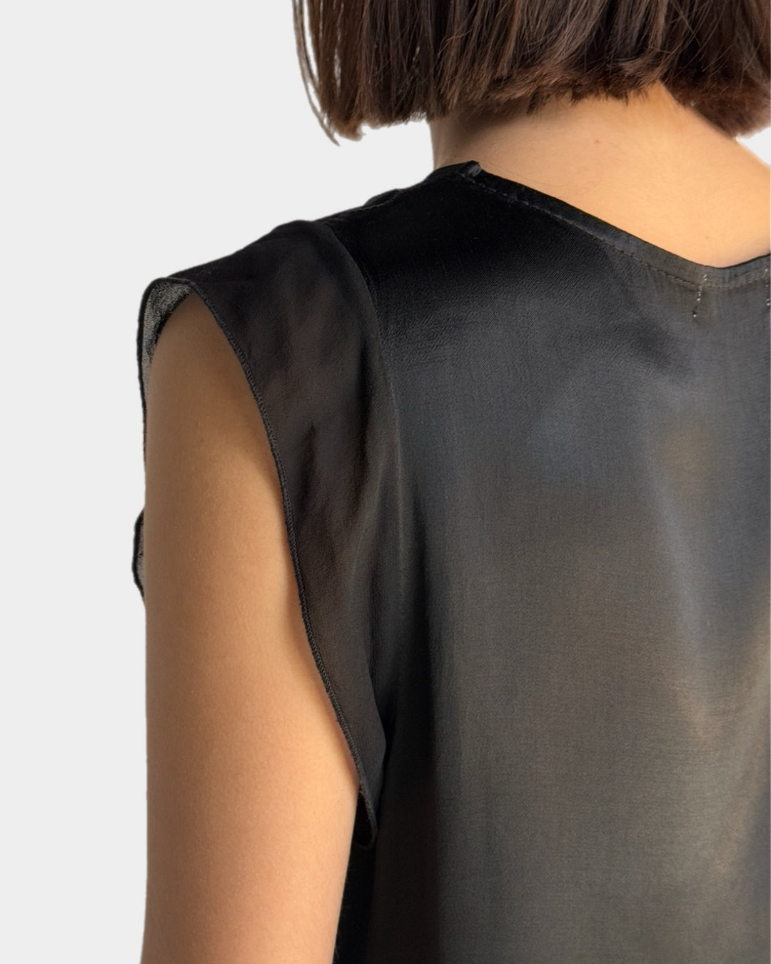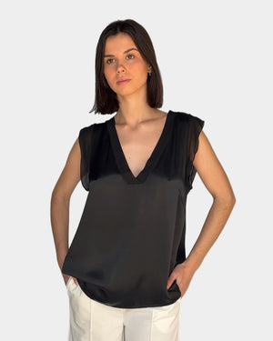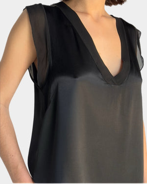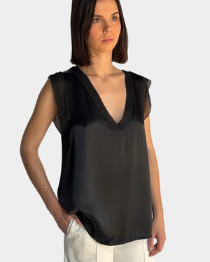 This black viscose top features a fluid, lightweight design that drapes beautifully over the body, creating an elegant and relaxed silhouette. The deep V-neckline is framed by wide, overlapping bands of fabric, adding a subtle yet sophisticated detail to the top. The sleeves are delicately capped, with a slight sheerness that complements the soft sheen of the viscose. The top's minimalist design makes it a versatile piece that can be easily dressed up or down, perfect for pairing with high-waisted skirts or your favorite jeans for an effortlessly chic look.