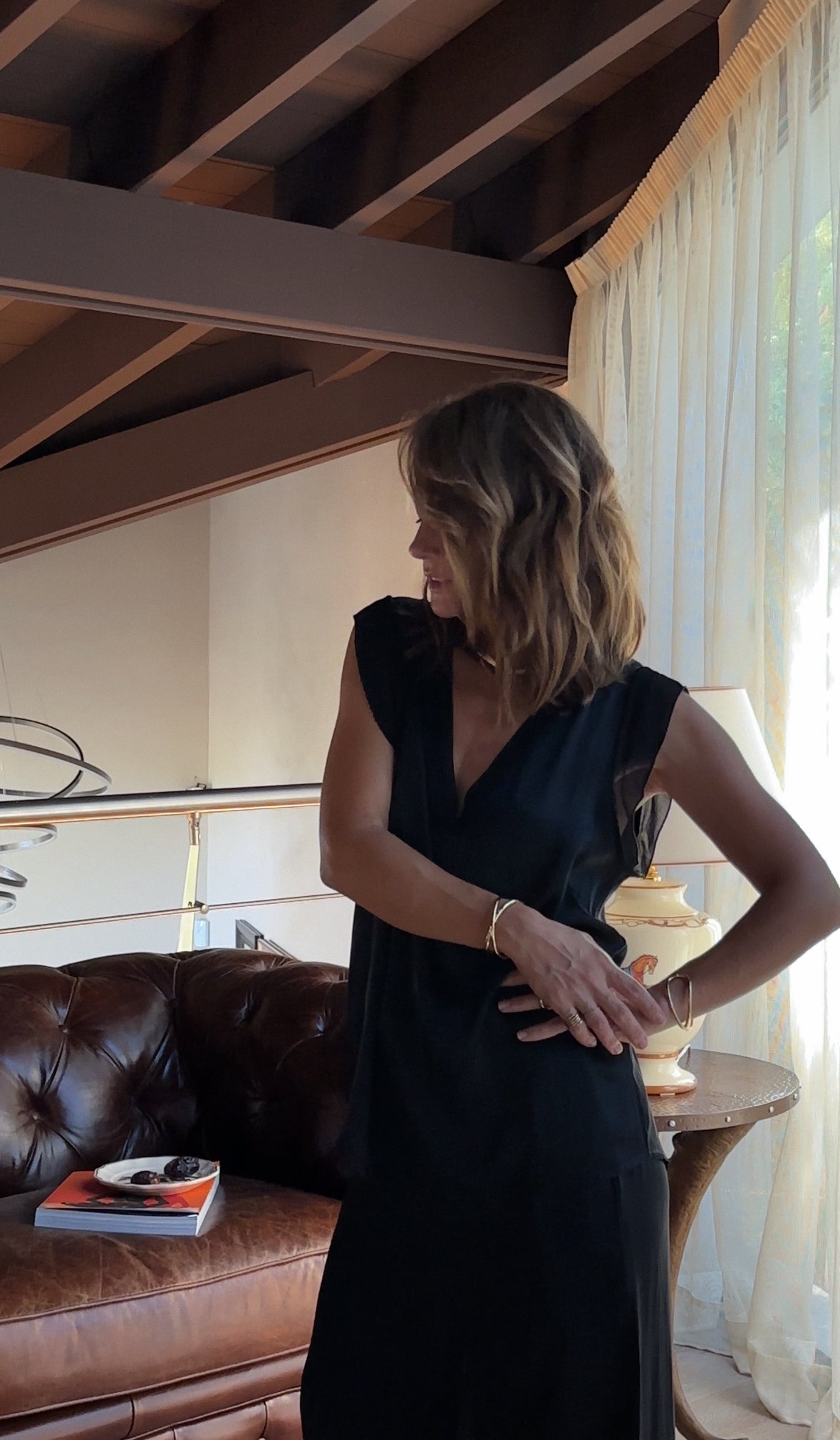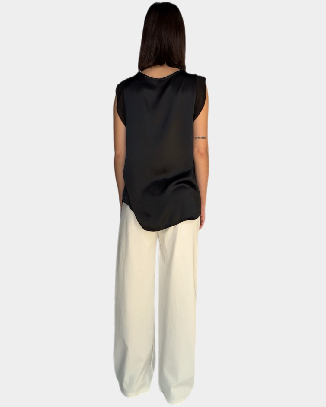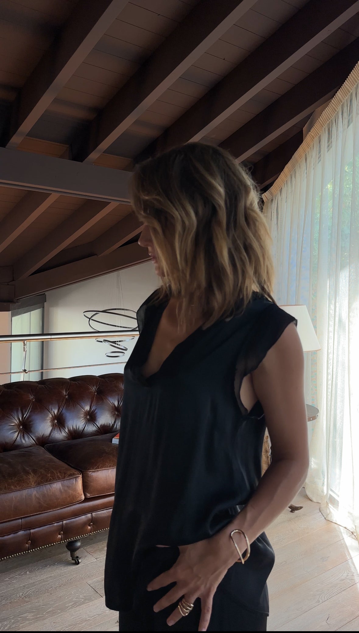 This black viscose top features a fluid, lightweight design that drapes beautifully over the body, creating an elegant and relaxed silhouette. The deep V-neckline is framed by wide, overlapping bands of fabric, adding a subtle yet sophisticated detail to the top. The sleeves are delicately capped, with a slight sheerness that complements the soft sheen of the viscose. The top's minimalist design makes it a versatile piece that can be easily dressed up or down, perfect for pairing with high-waisted skirts or your favorite jeans for an effortlessly chic look.