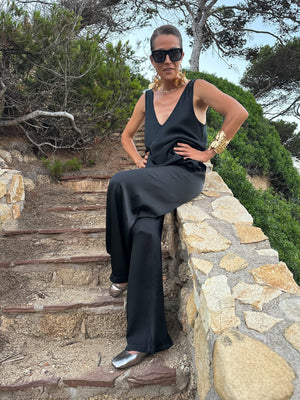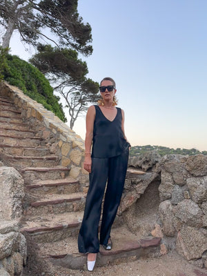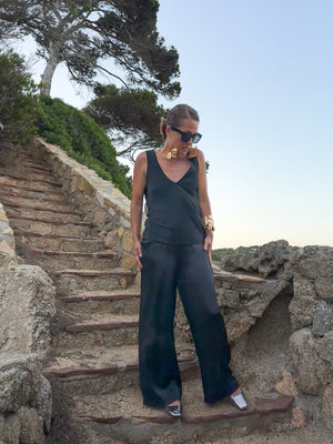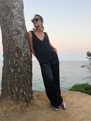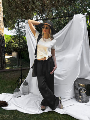 These black viscose trousers are the perfect blend of comfort and elegance. The fabric flows effortlessly, giving a relaxed yet sophisticated look. The elastic waistband with drawstrings provides a customizable fit, while the frayed edges of the waistband add a subtle, chic touch.