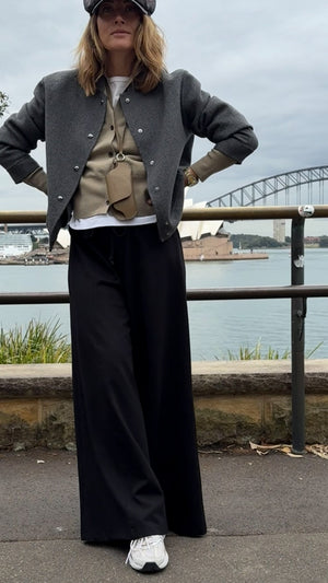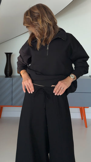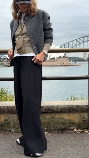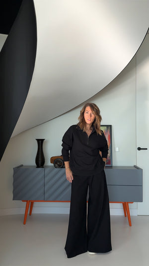 These wide-leg pants in a deep black shade are a must-have this season. Designed with a comfortable wide elastic waistband, they offer both style and ease of wear. Perfect on their own or paired with the matching sweatshirt for a coordinated look.