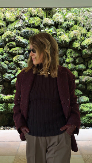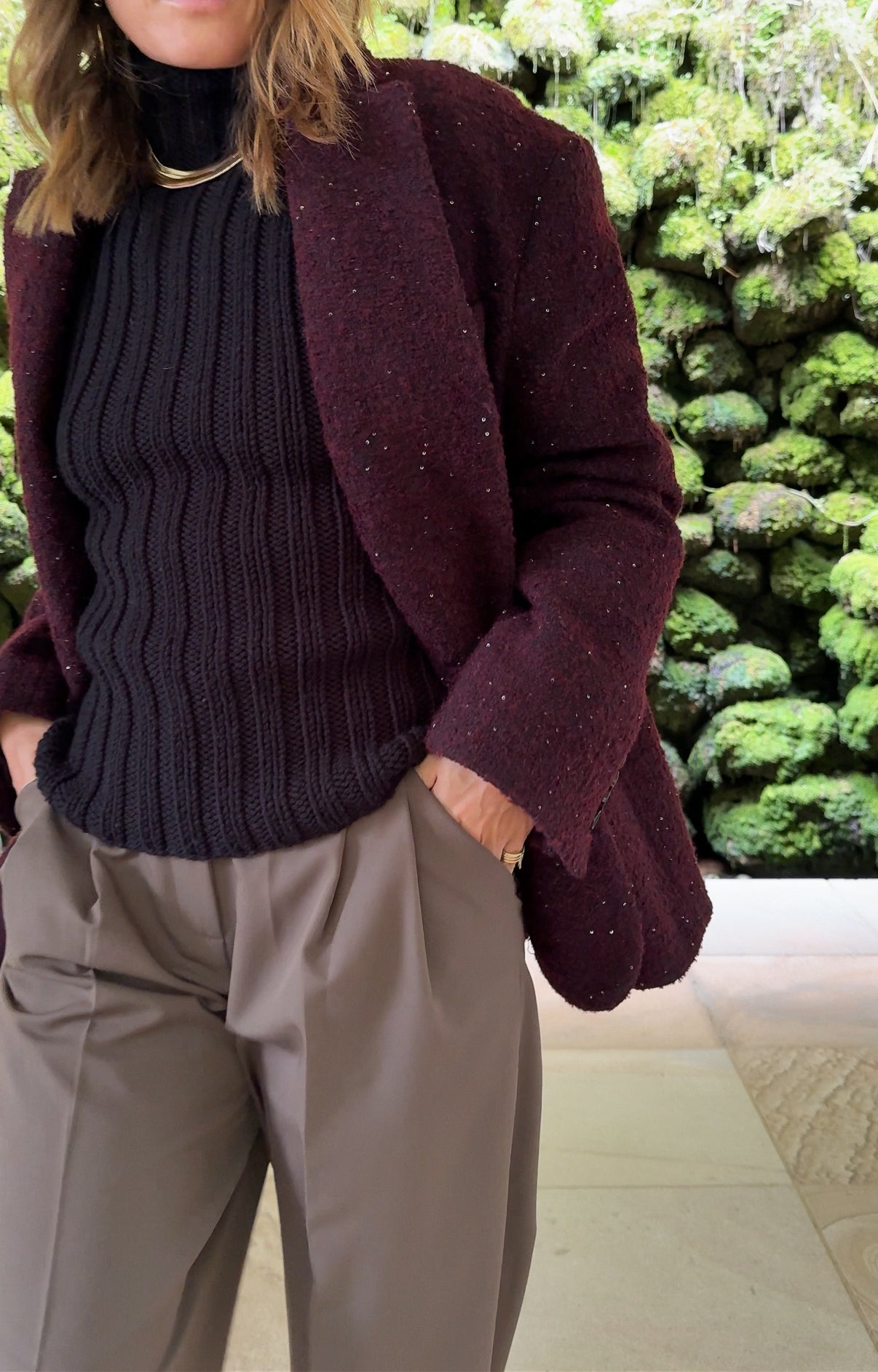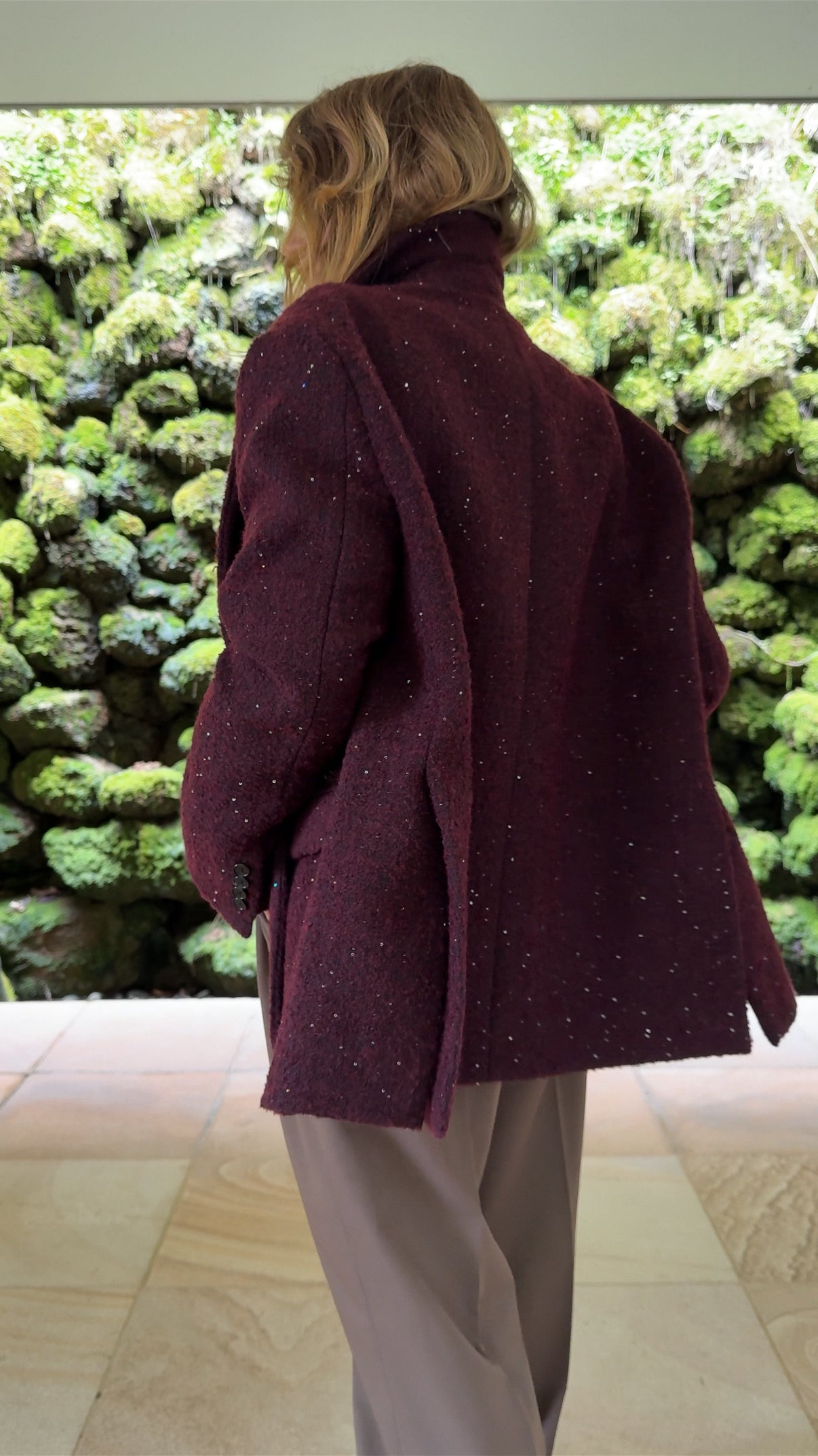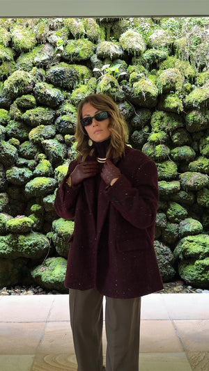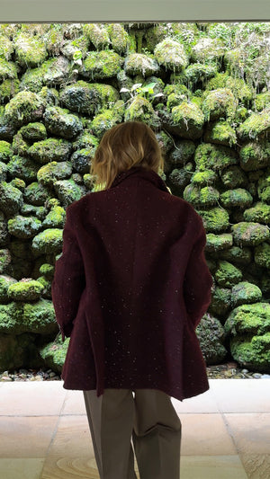 Sophisticated oversized burgundy coat, designed for those who appreciate a blend of style and comfort. Crafted with a relaxed fit, this coat features a classic notch collar and cuffed sleeves adorned with delicate buttons, adding a touch of refinement to your look. Two back slits provide ease of movement, while subtle sequins throughout the fabric offer a hint of sparkle, making this piece stand out. Perfect for layering over any outfit, this coat combines functionality with an effortless elegance. A versatile addition to your fall wardrobe, it's ideal for both casual and refined occasions.