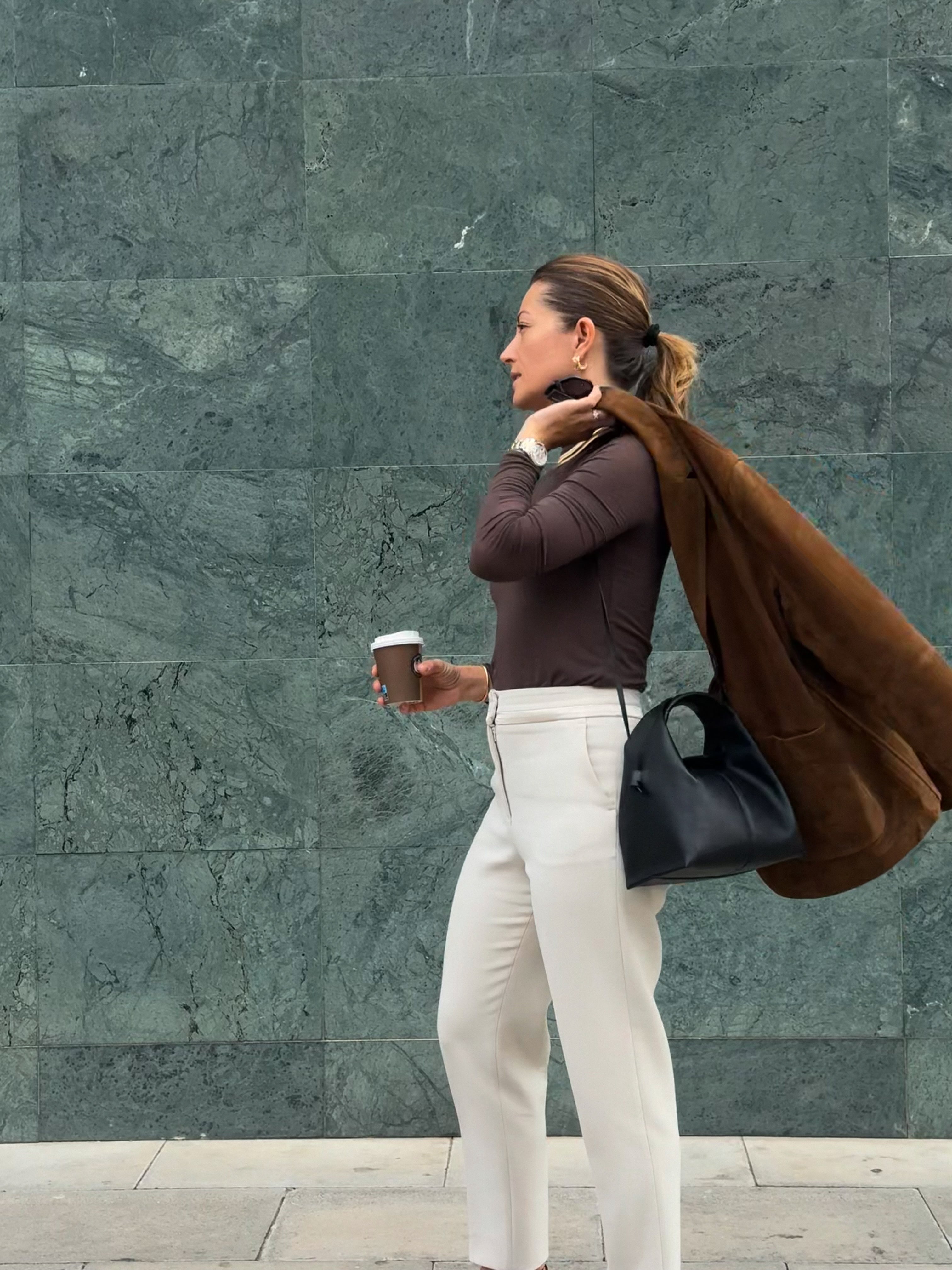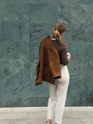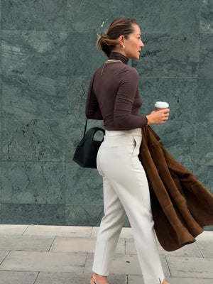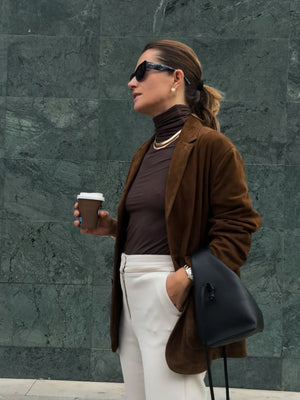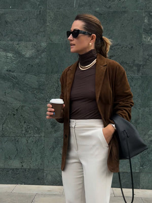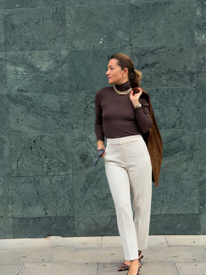 This chocolate-colored turtleneck is the perfect blend of elegance and functionality. Lightweight and slightly sheer, it offers a delicate, airy feel while still keeping you warm. Ideal for layering under jackets or sweaters, yet sophisticated enough to wear on its own for a minimalist look.