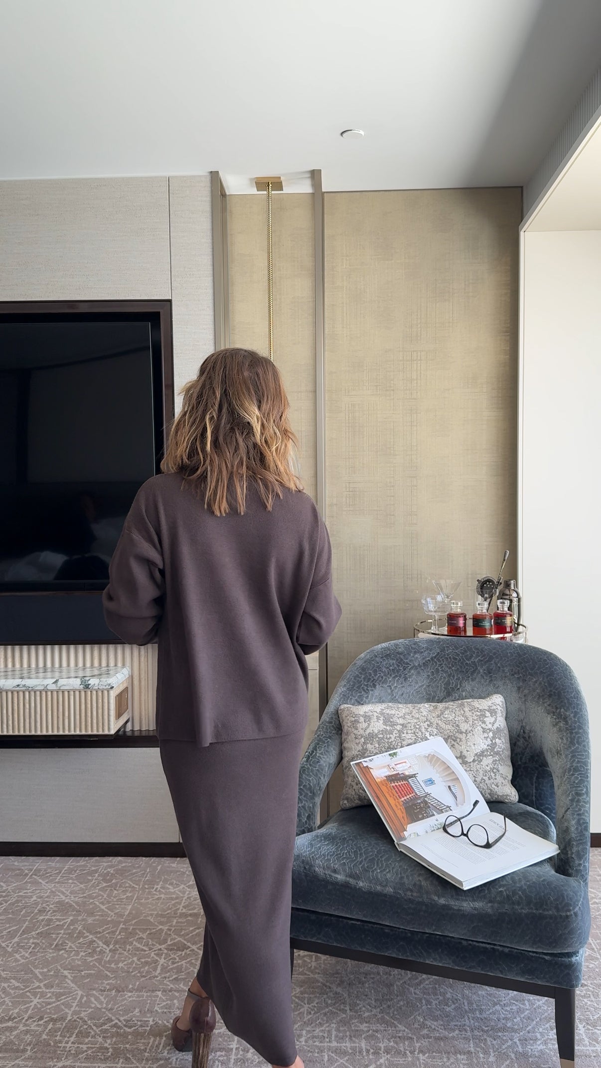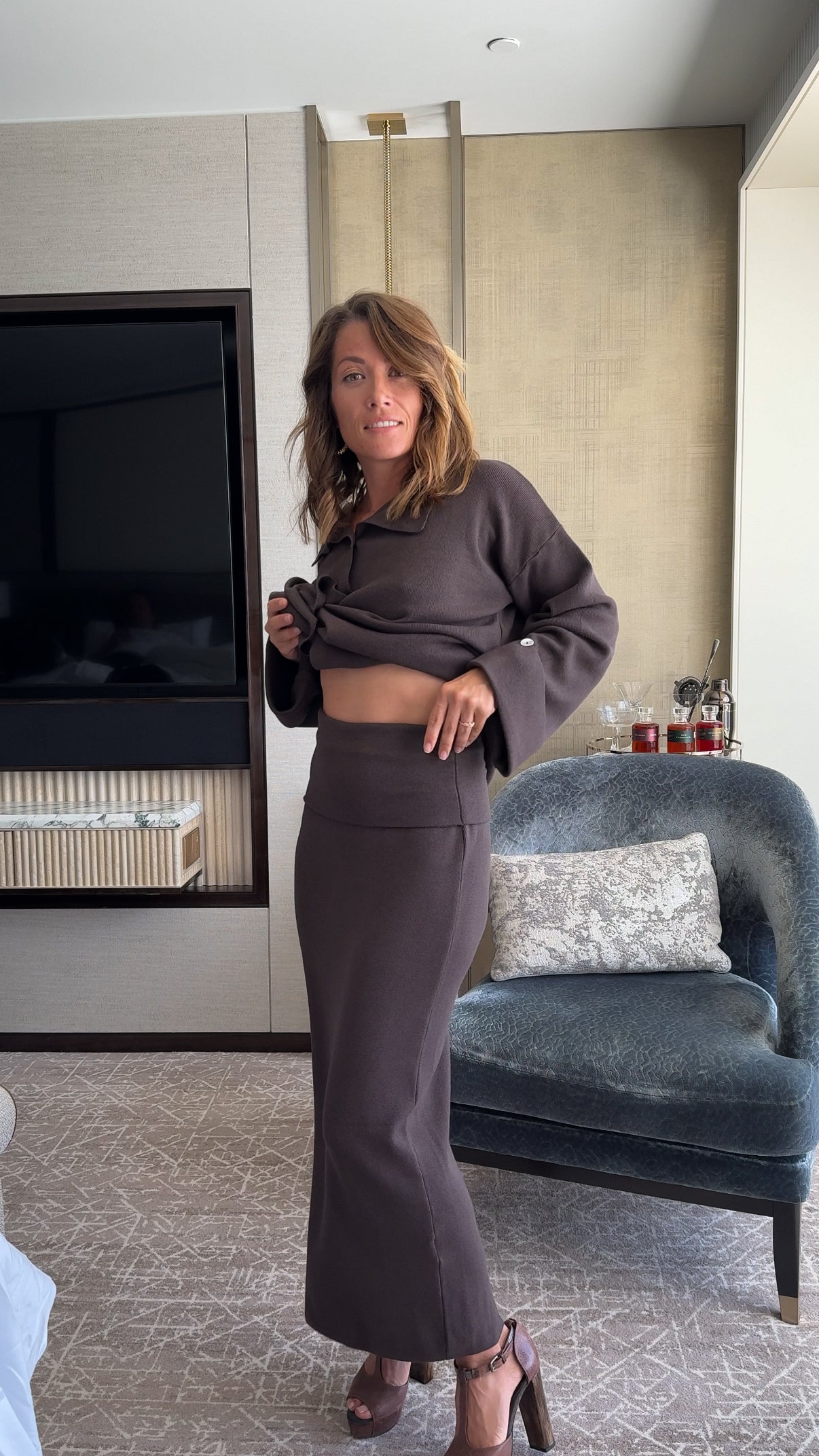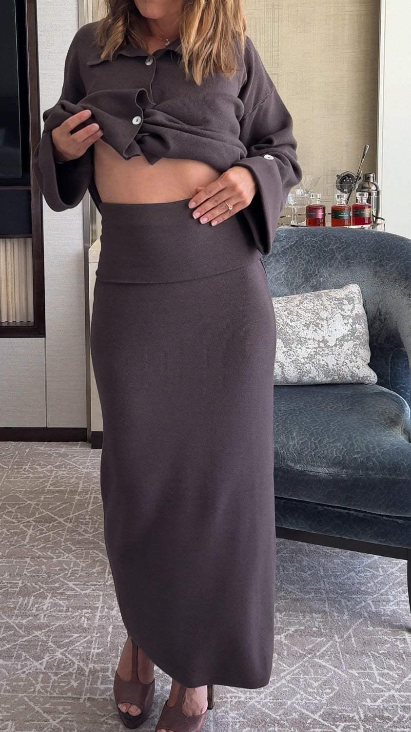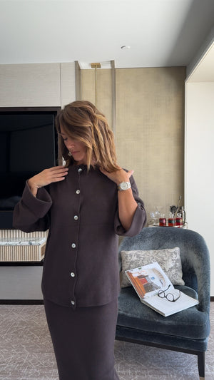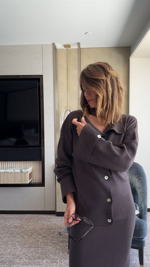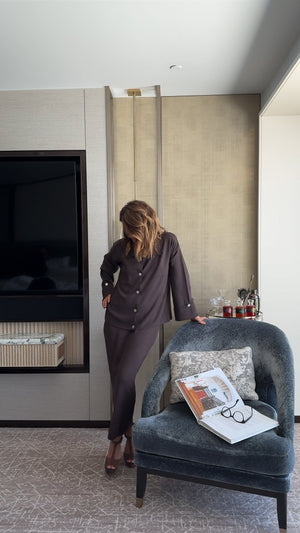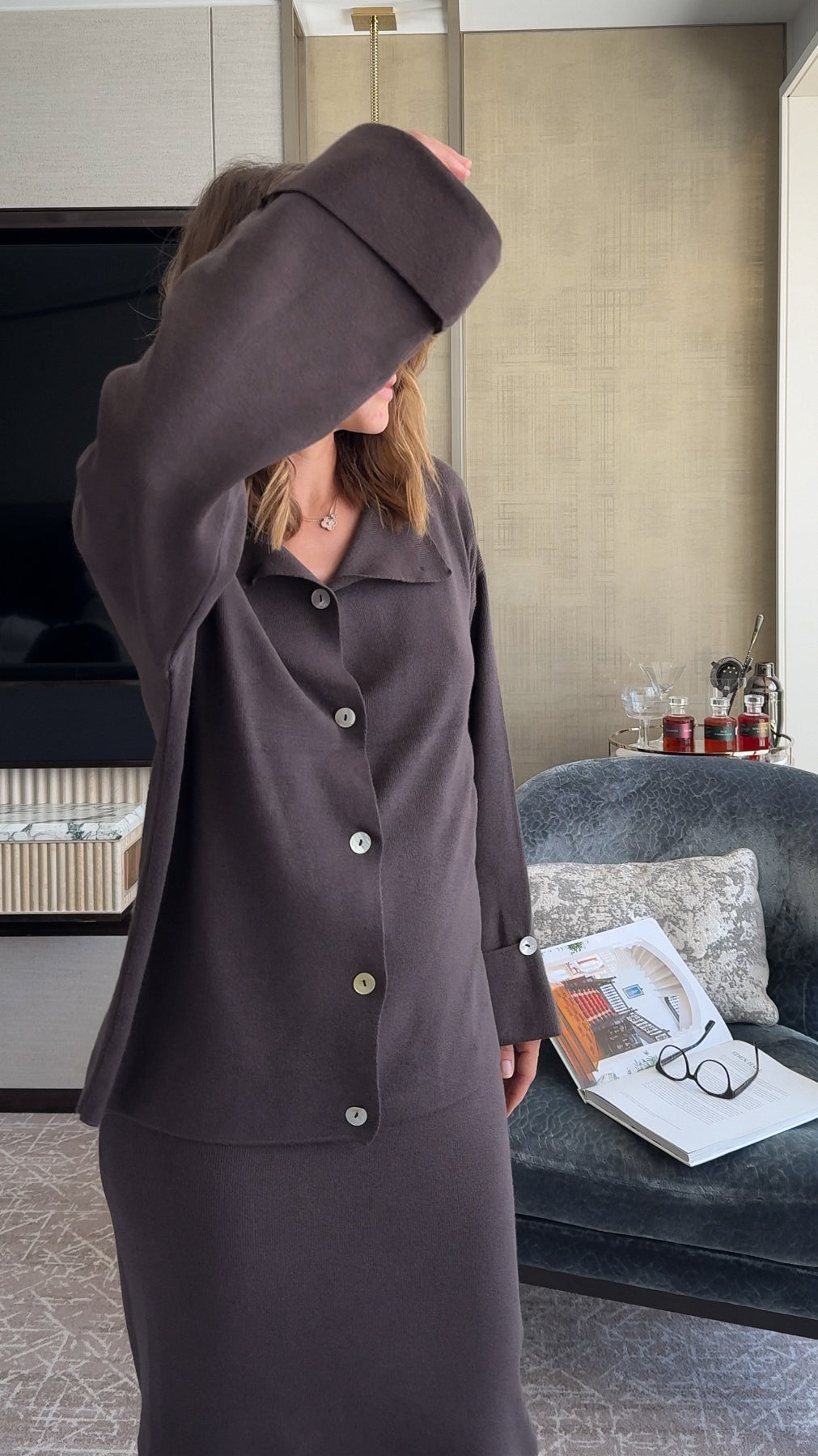 This chocolate-colored set is all about versatility and comfort with a touch of elegance. The skirt features a soft, wide elastic waistband, allowing you to adjust the length effortlessly to suit your style. The extended cardigan, with its wide sleeves and button-up design, can be worn on its own or layered for a chic look. It has a relaxed dropped shoulder and rolled cuffs, adding a modern edge to the timeless silhouette. Perfect for dressing up or down, this set is your go-to for effortless sophistication.