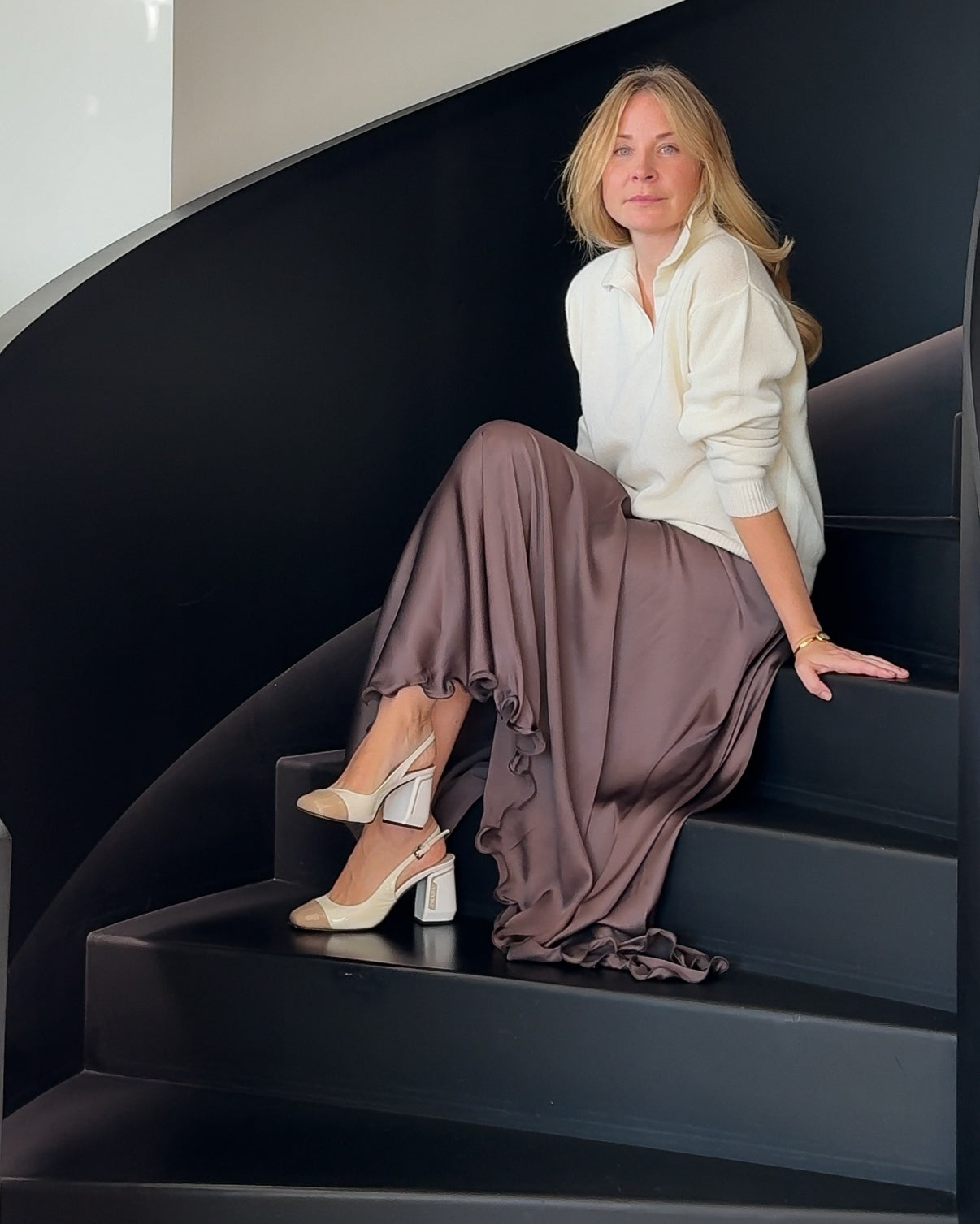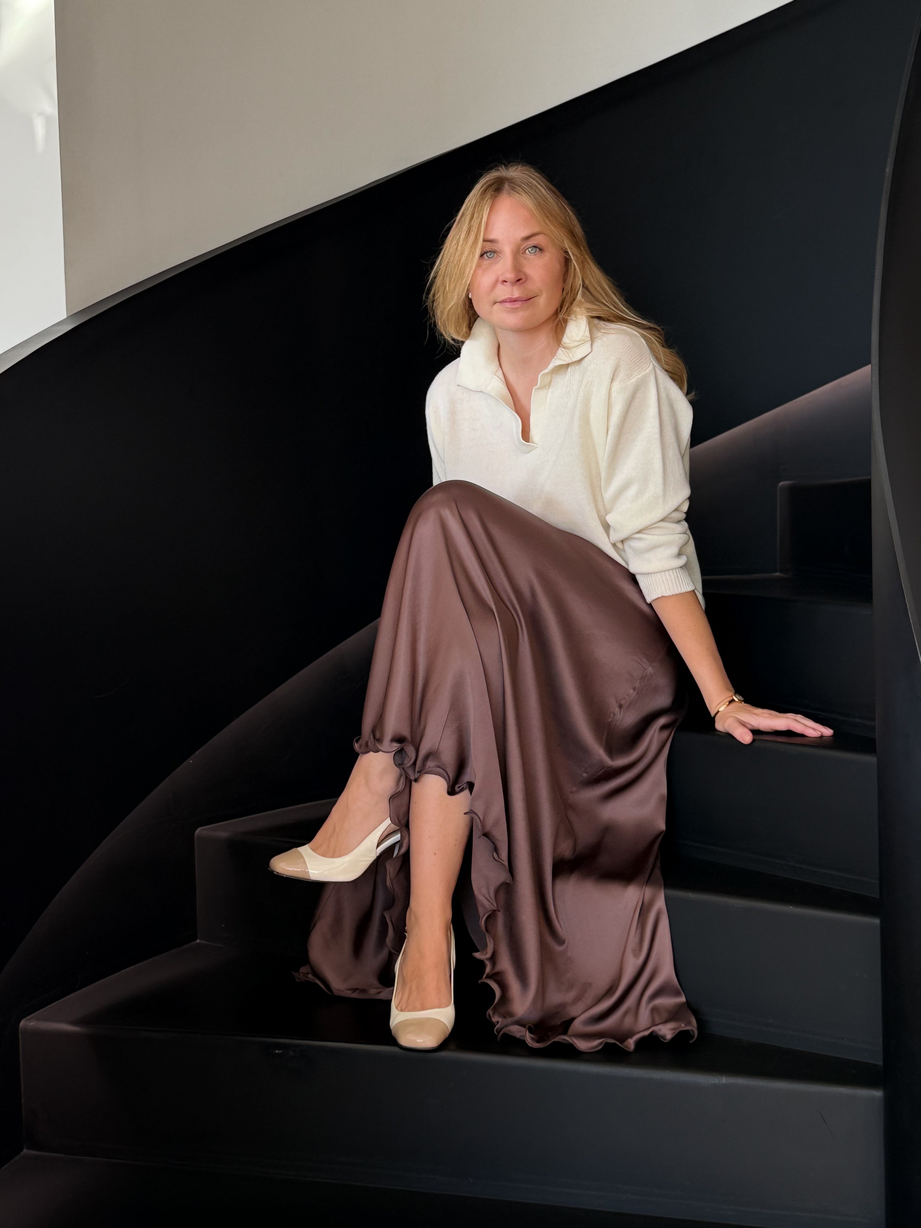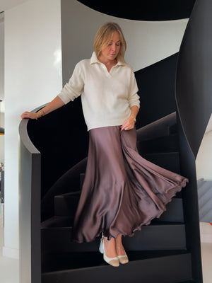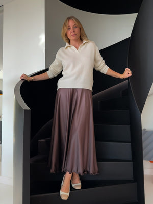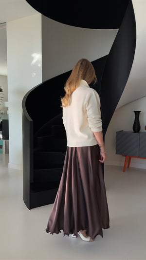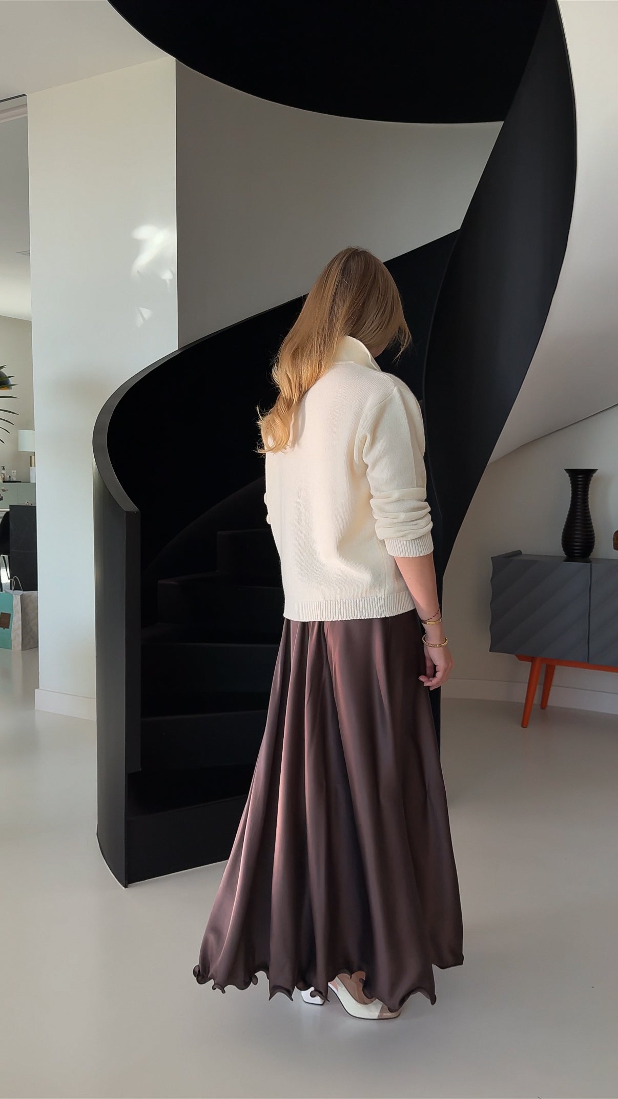 Flowing and lightweight viscose maxi skirt. It gracefully drapes down to the floor, making each step feel like a gentle sway. The wide elastic waistband adds comfort and ease, making it perfect for styling up or keeping it casual. Ideal for those days when you want to feel both relaxed and graceful.