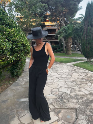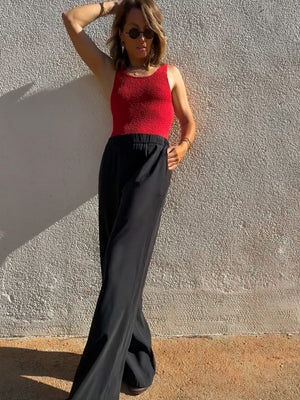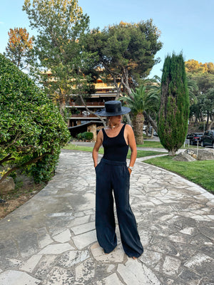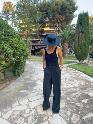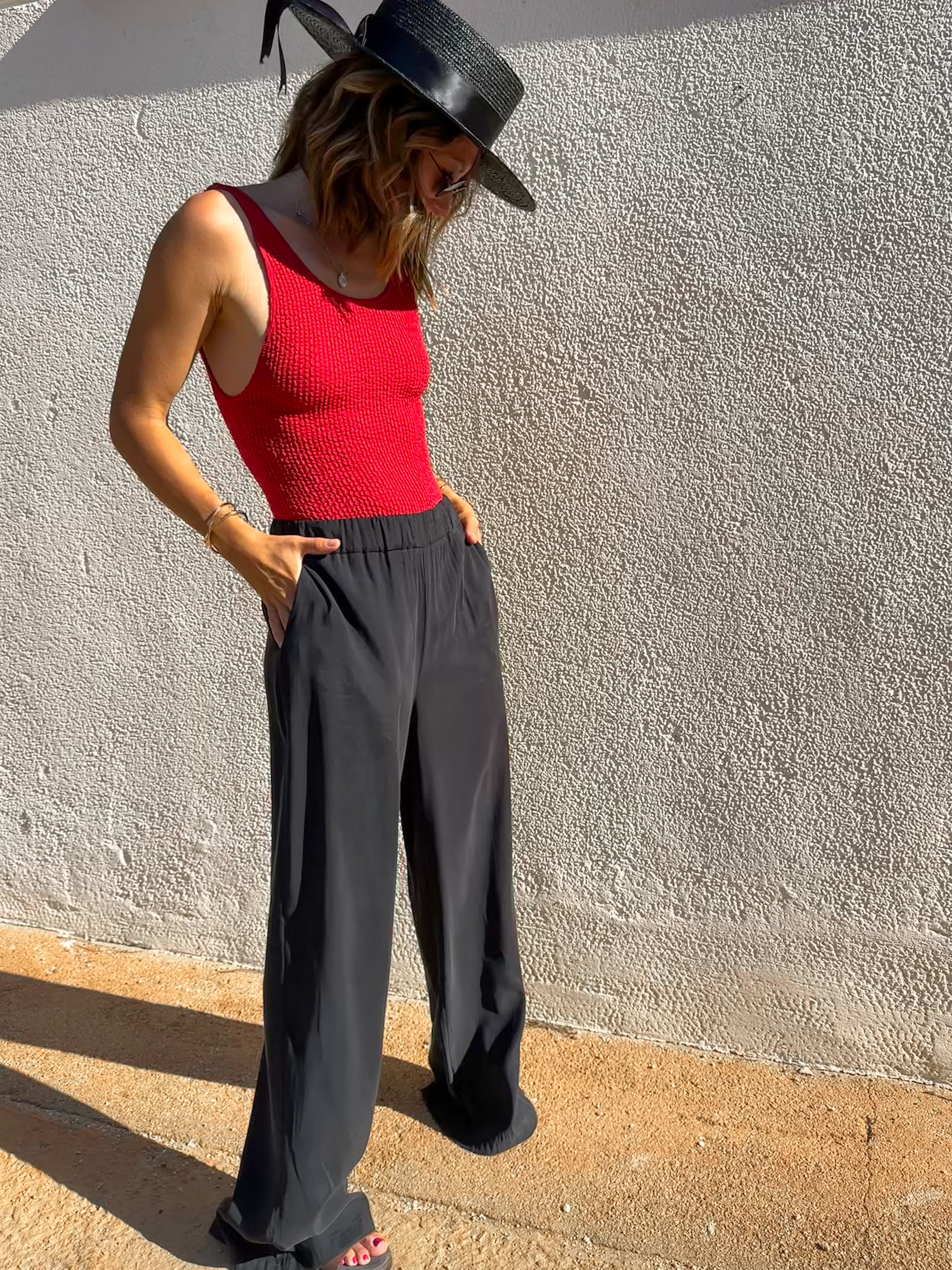 Elegant wide-leg trousers crafted from luxurious viscose. The ultra-soft fabric drapes beautifully, while the full-length silhouette adds a touch of sophistication. Designed with a wide elastic waistband for a comfortable fit, these trousers also feature practical side pockets, making them as functional as they are stylish. Perfect for any occasion.