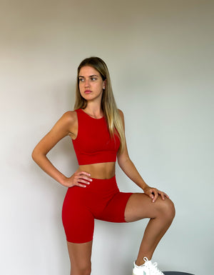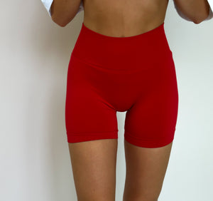 Red high-waisted bike shorts crafted with a wide, secure waistband provide a flattering and supportive fit. The rich red color adds a versatile touch to your wardrobe, making them perfect for any workout or casual day out. Pair them with a matching crop top for a sleek, coordinated look, or style them with an oversized hoodie or blazer or long cardigan for a relaxed vibe.