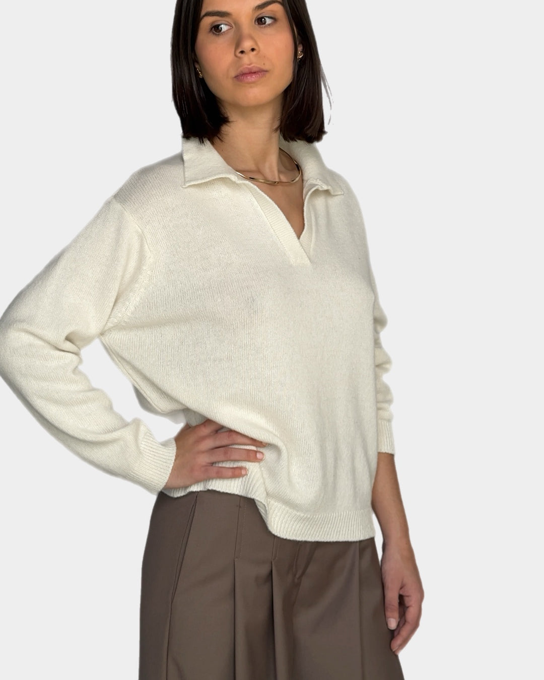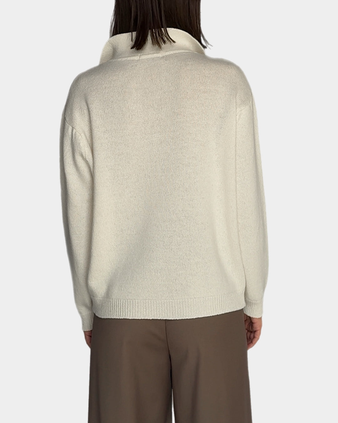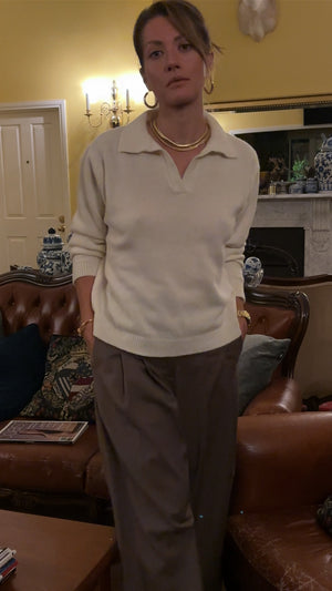 This sweater is a cozy blend of wool and cashmere, offering the perfect balance of warmth and softness. With its relaxed fit and spread collar detail, it’s an effortlessly elegant piece for your everyday wardrobe. Ideal for layering or wearing on its own, it’s a timeless staple you’ll reach for season after season.