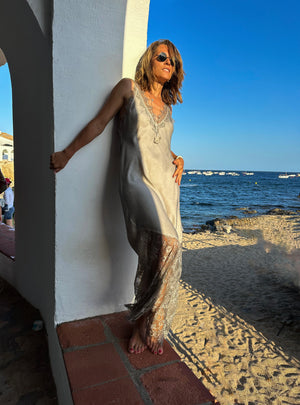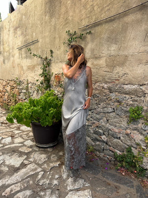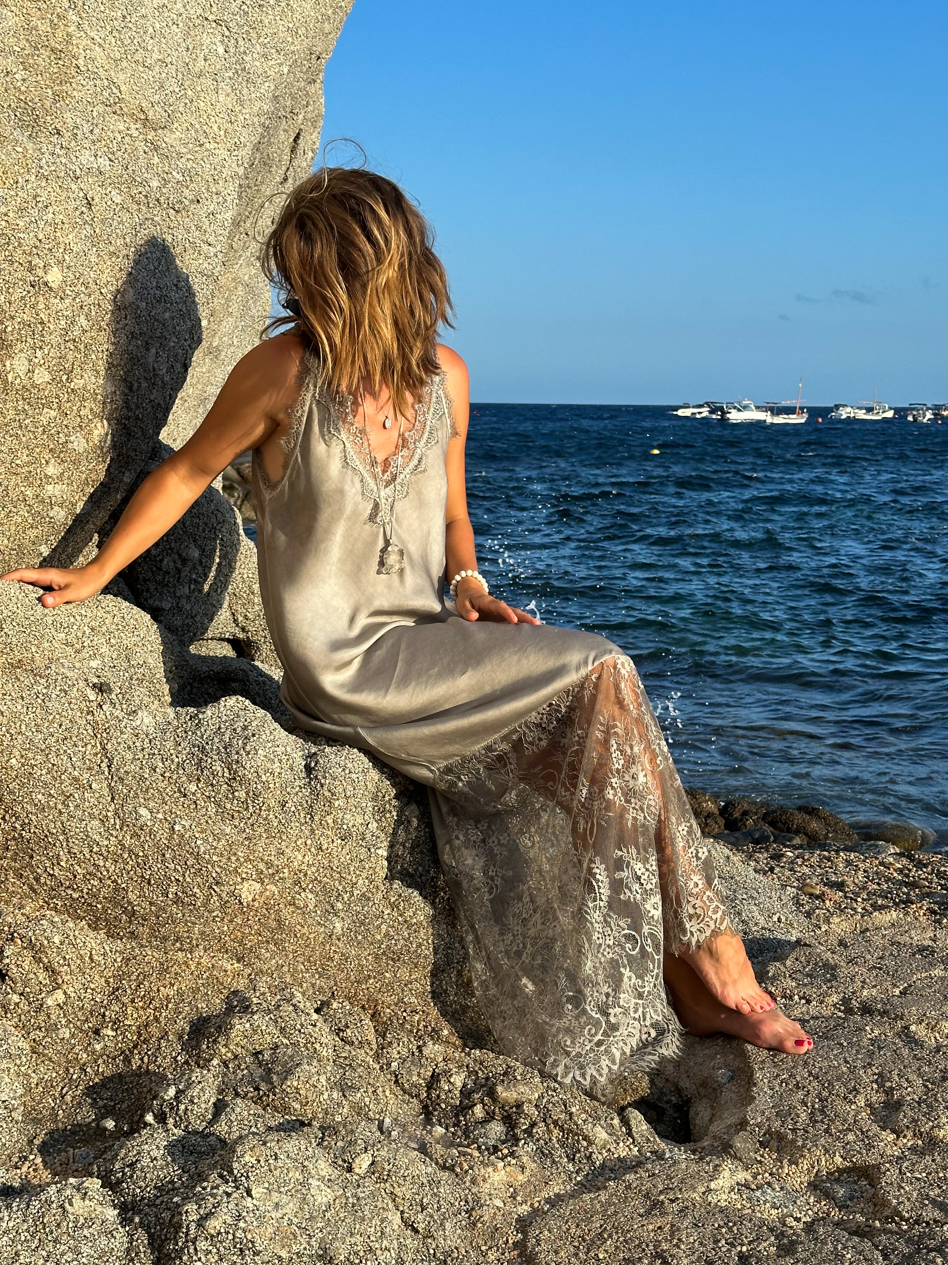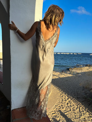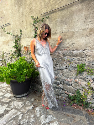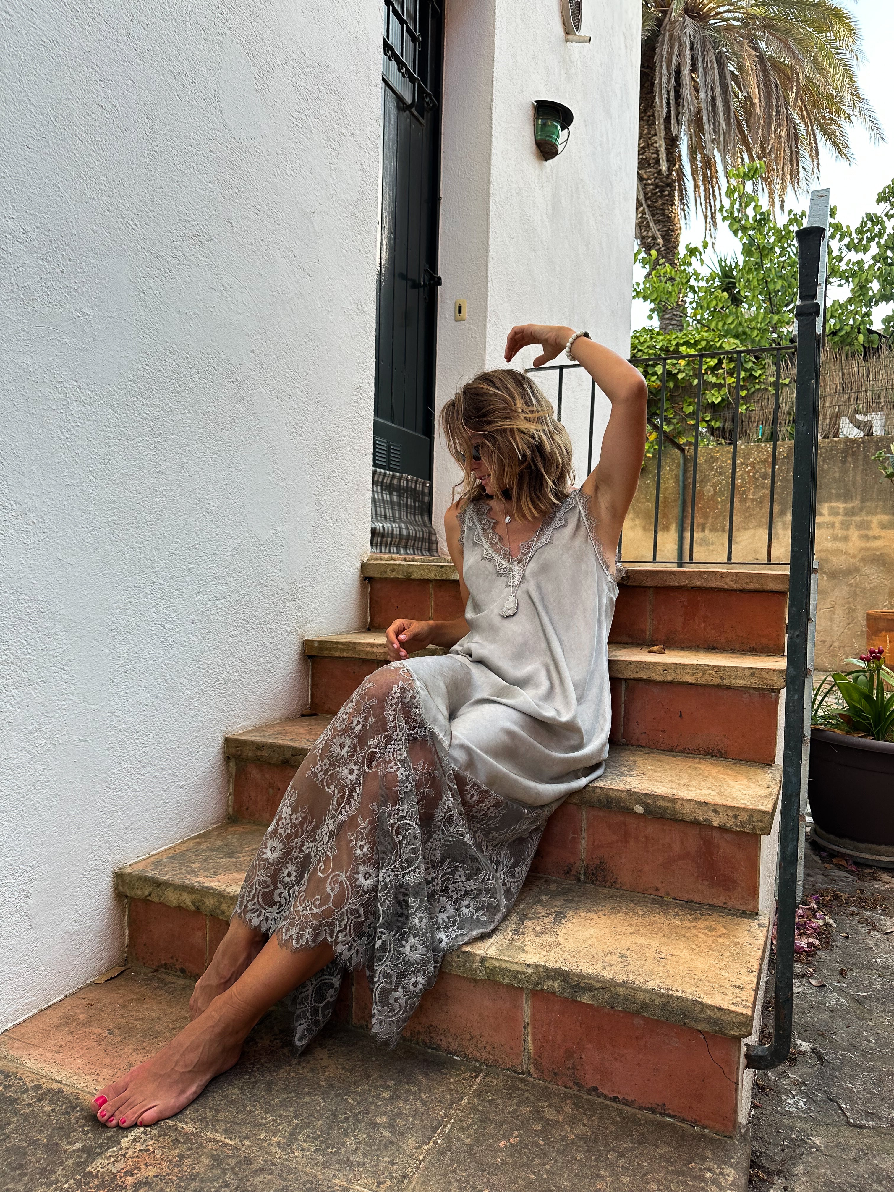 This lace-trimmed camisole dress is crafted from soft and smooth viscose, offering a luxurious feel against the skin. The deep V-neckline is adorned with delicate lace, adding a touch of sophistication to this elegant piece. The bottom part of the dress is also detailed with lace, creating a beautifully scalloped edge that elevates the design. The fit is relaxed yet flattering, draping effortlessly over the body for a silhouette that is both feminine and chic. This versatile dress can be worn on its own or layered under a blazer or cardigan for a stylish look suitable for any occasion.