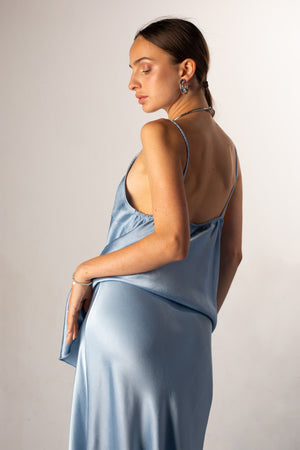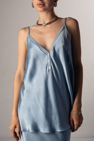 This delicate camisole top is crafted from luxurious viscose fabric that feels silky and smooth against the skin. The top features a flattering V-neckline, accentuated by a subtle sheen that catches the light beautifully. The thin spaghetti straps add an elegant touch, while the slightly flared hem offers a comfortable and relaxed fit. The front is adorned with a small button detail, adding a refined finish to the minimalist design. Perfect for layering under blazers or wearing on its own for a chic, understated look, this top is a versatile addition to any wardrobe. The soft blue hue enhances its feminine appeal, making it an ideal choice for both casual and dressier occasions.