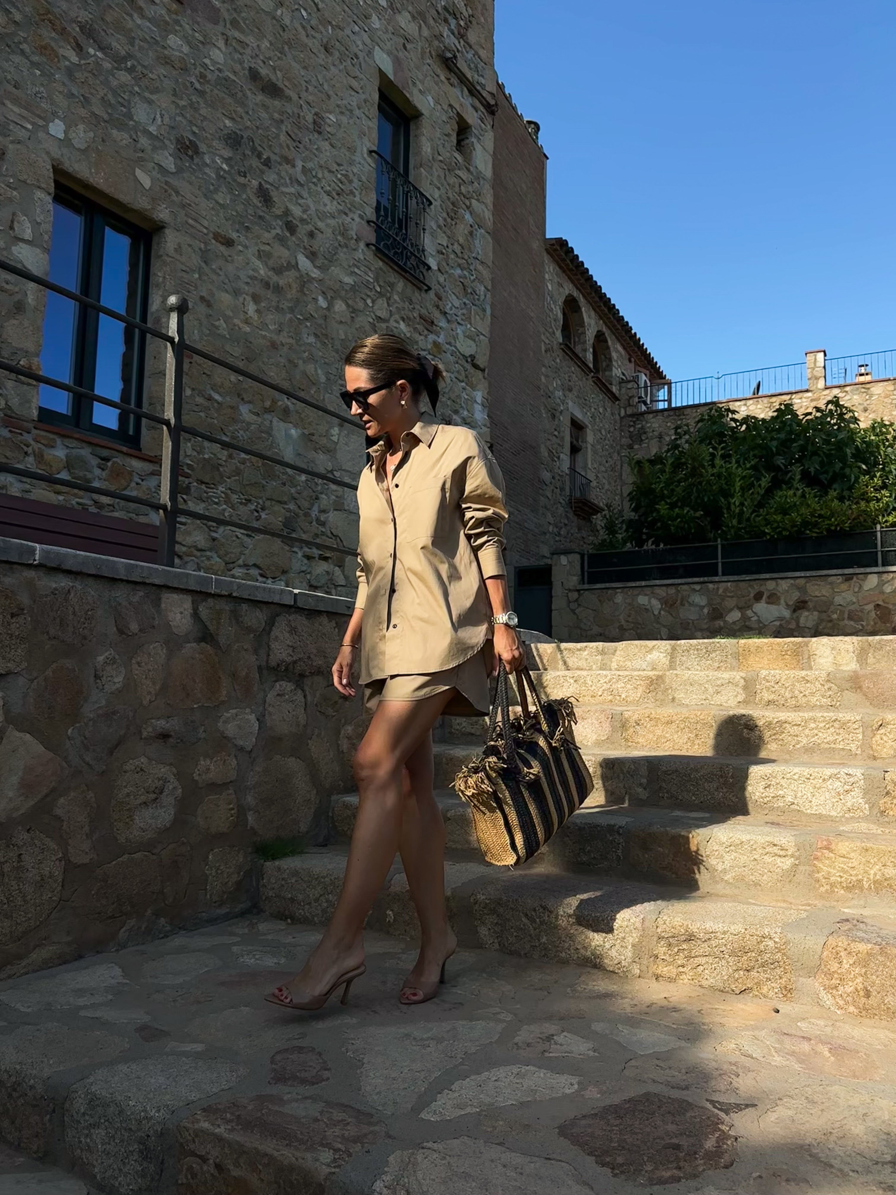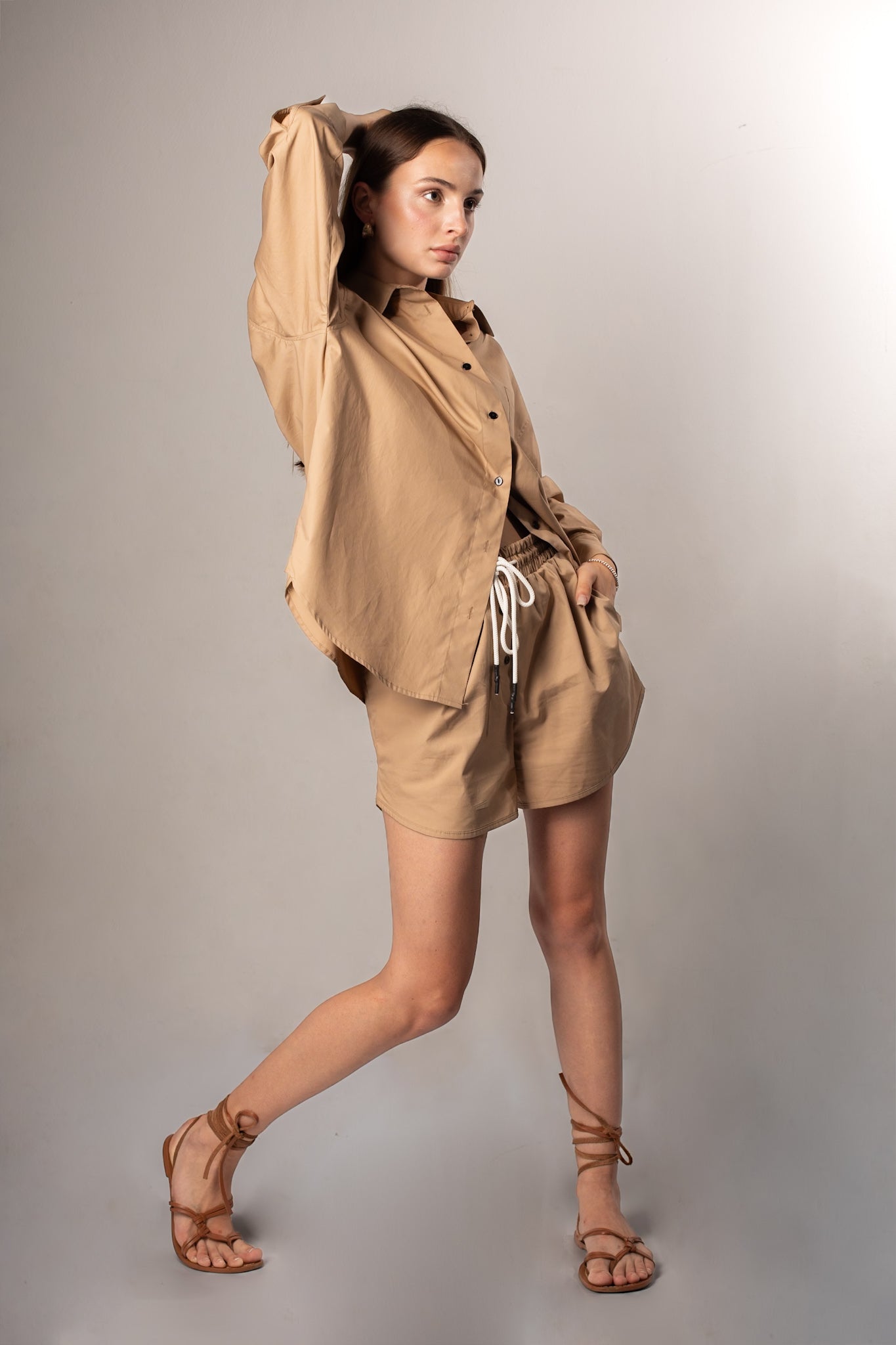 A lightweight camel-colored cotton suit is your perfect choice for summer strolls. The shorts, featuring an elastic waistband and adjustable drawstring, ensure comfort and freedom of movement, while the loose-fit button-up shirt creates a relaxed yet stylish look. This set is a great addition to your everyday wardrobe, easily pairing with various accessories and shoes to highlight your unique style.