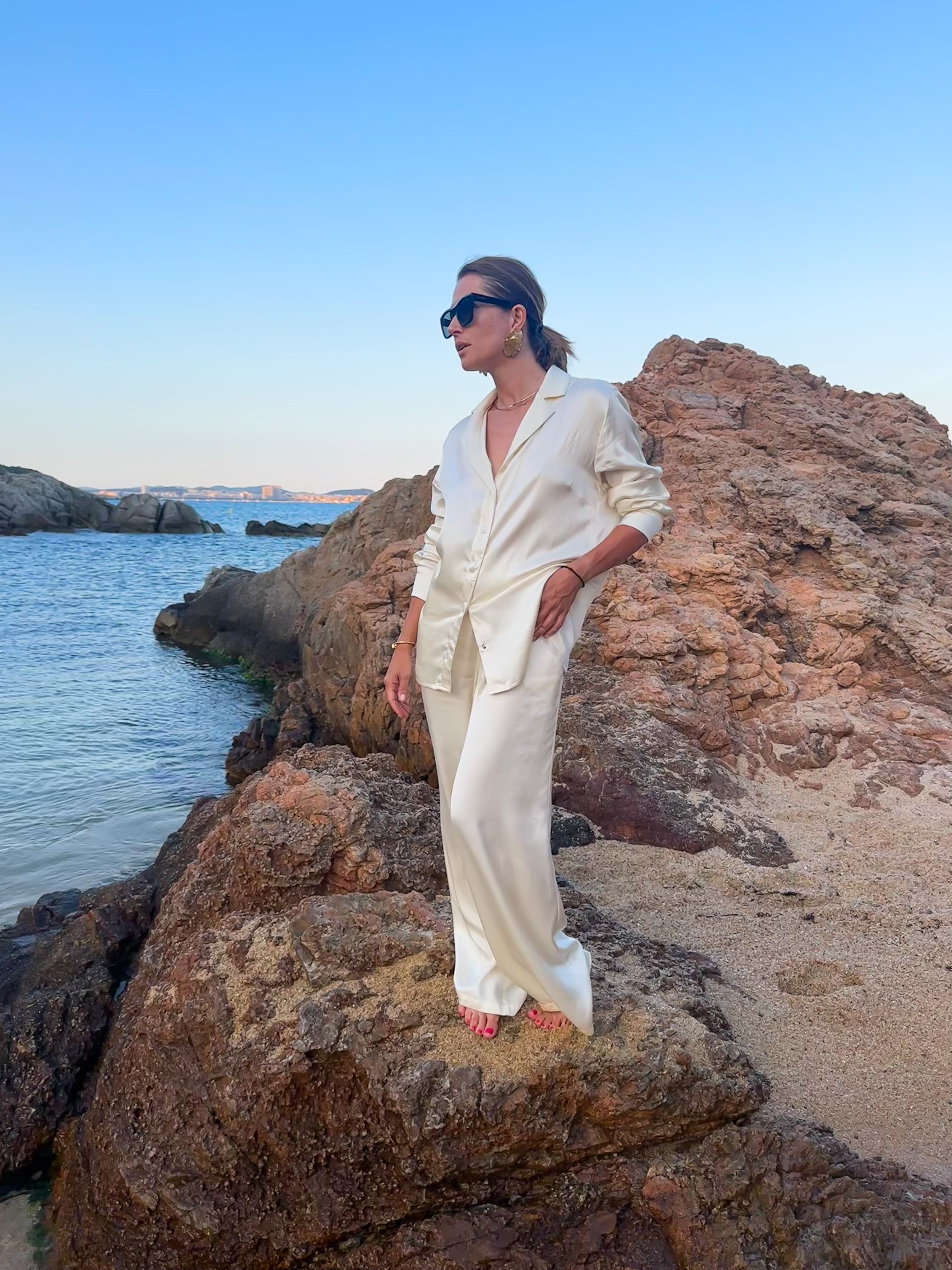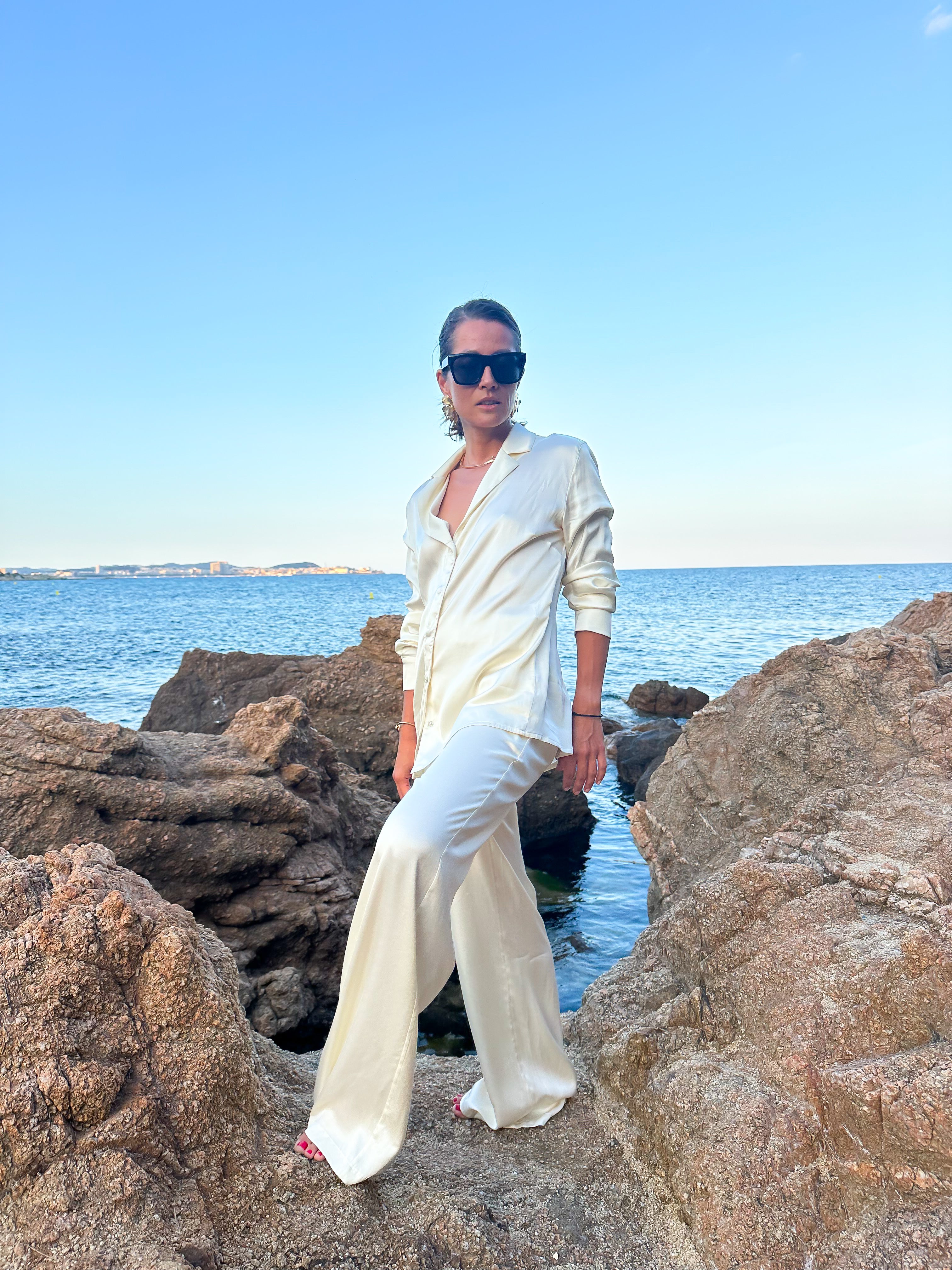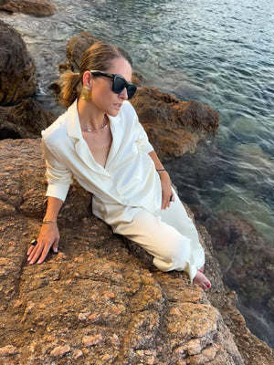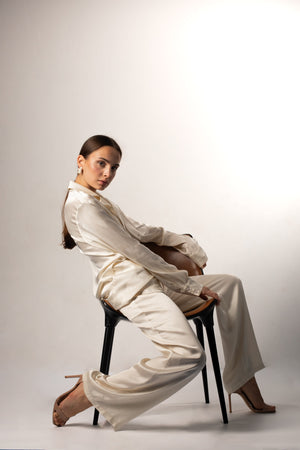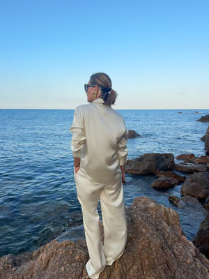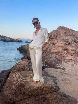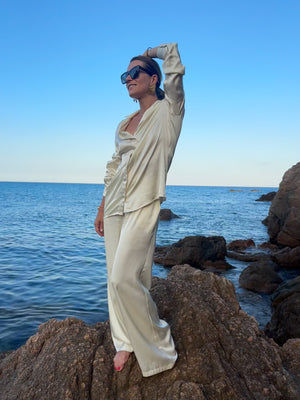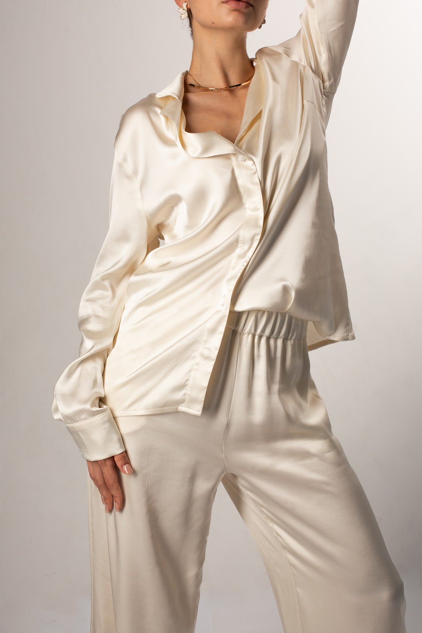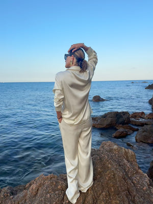 A viscose blouse in a pearl color is the perfect choice for a summer getaway. The lightweight and flowing fabric drapes beautifully on the body, allowing your skin to breathe even in hot weather. The comfortable shirt with a center front snap button closure creates a stylish and relaxed look. Pairs with the flowing pants in the same color and material or easily mixed and matched separately with other wardrobe essentials for versatile styling.