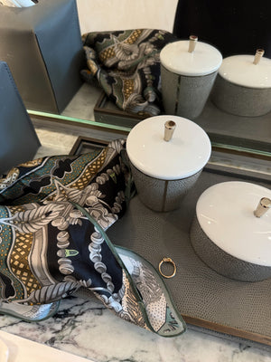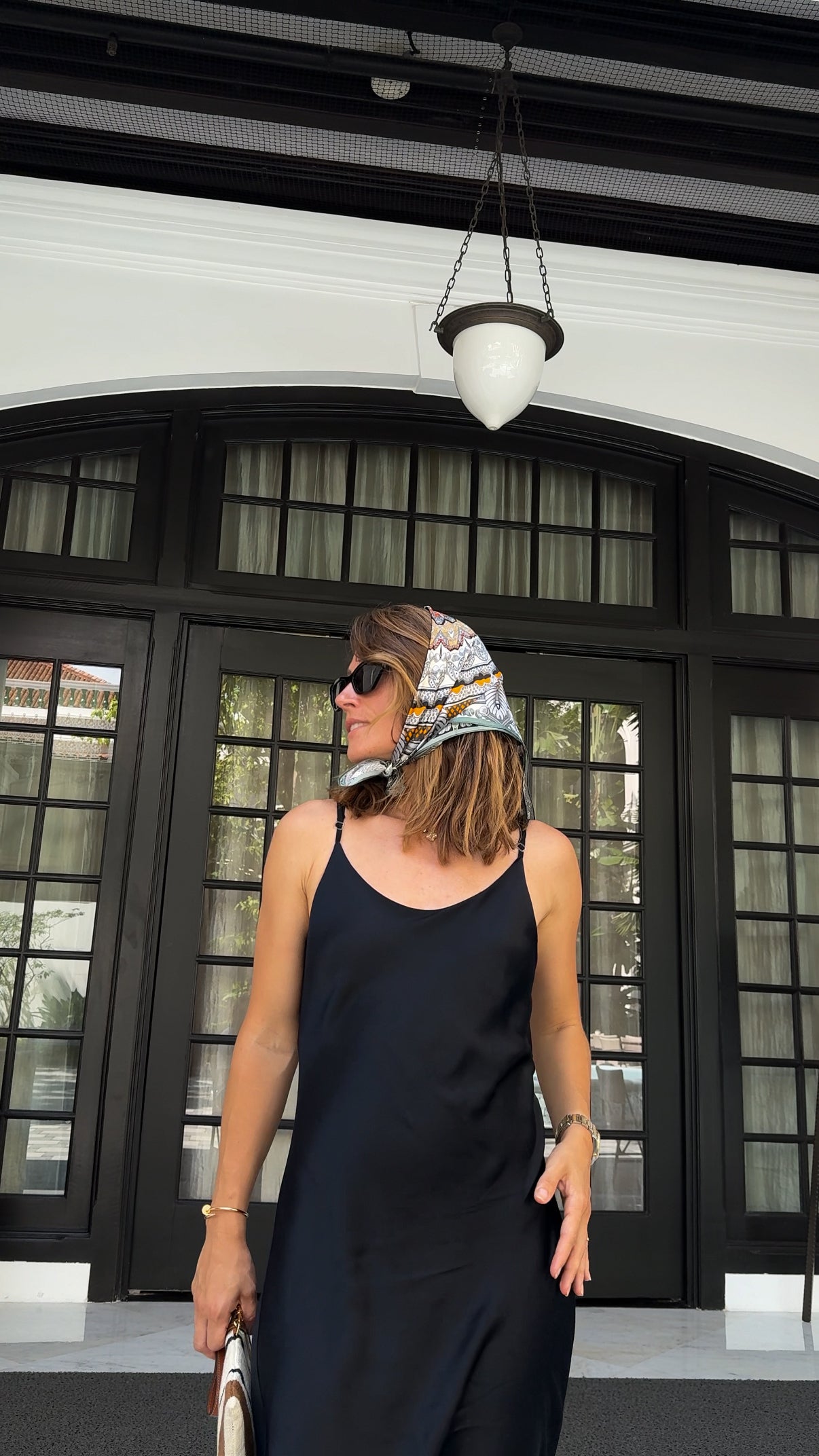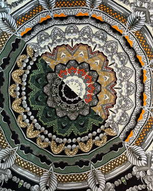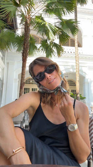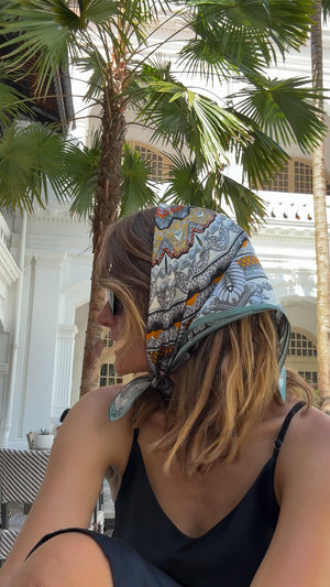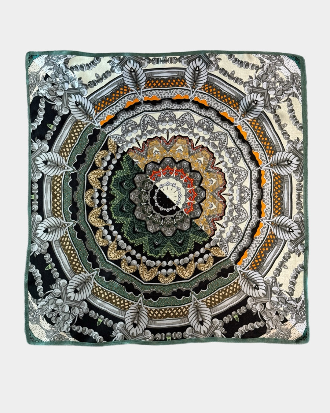 This vibrant silk scarf showcases an intricate mandala-inspired pattern in earthy tones, accented with rich greens, golds, and blacks. The detailed design features delicate leaf motifs and geometric elements, creating a stunning centerpiece for your outfit. Perfect for adding a bohemian touch to your look, this lightweight scarf is versatile enough to be styled around your neck, as a headscarf, or tied to your handbag for an effortless statement accessory.