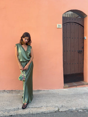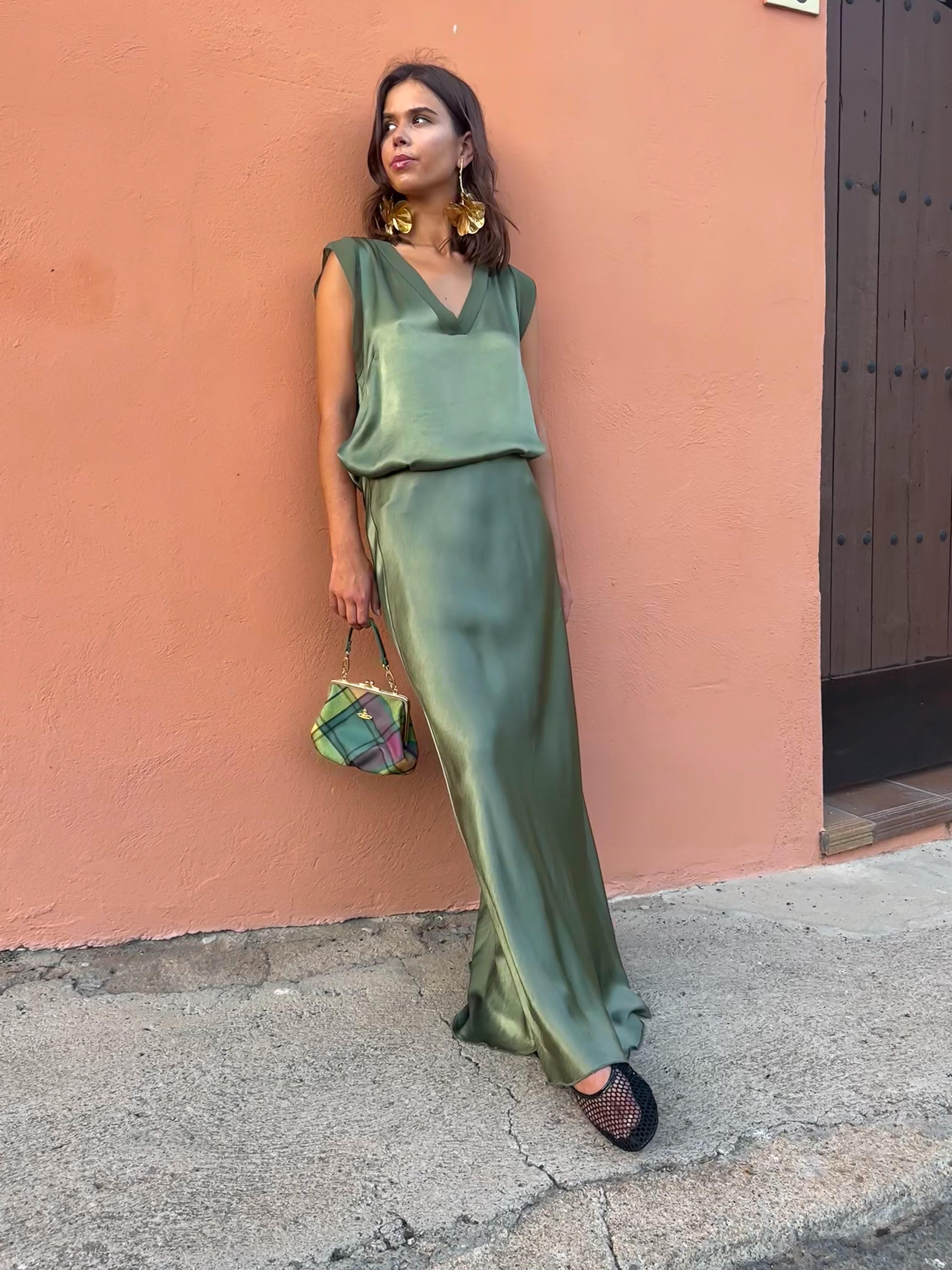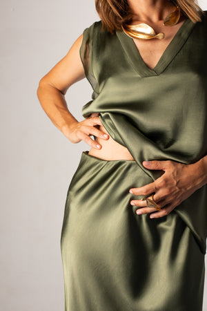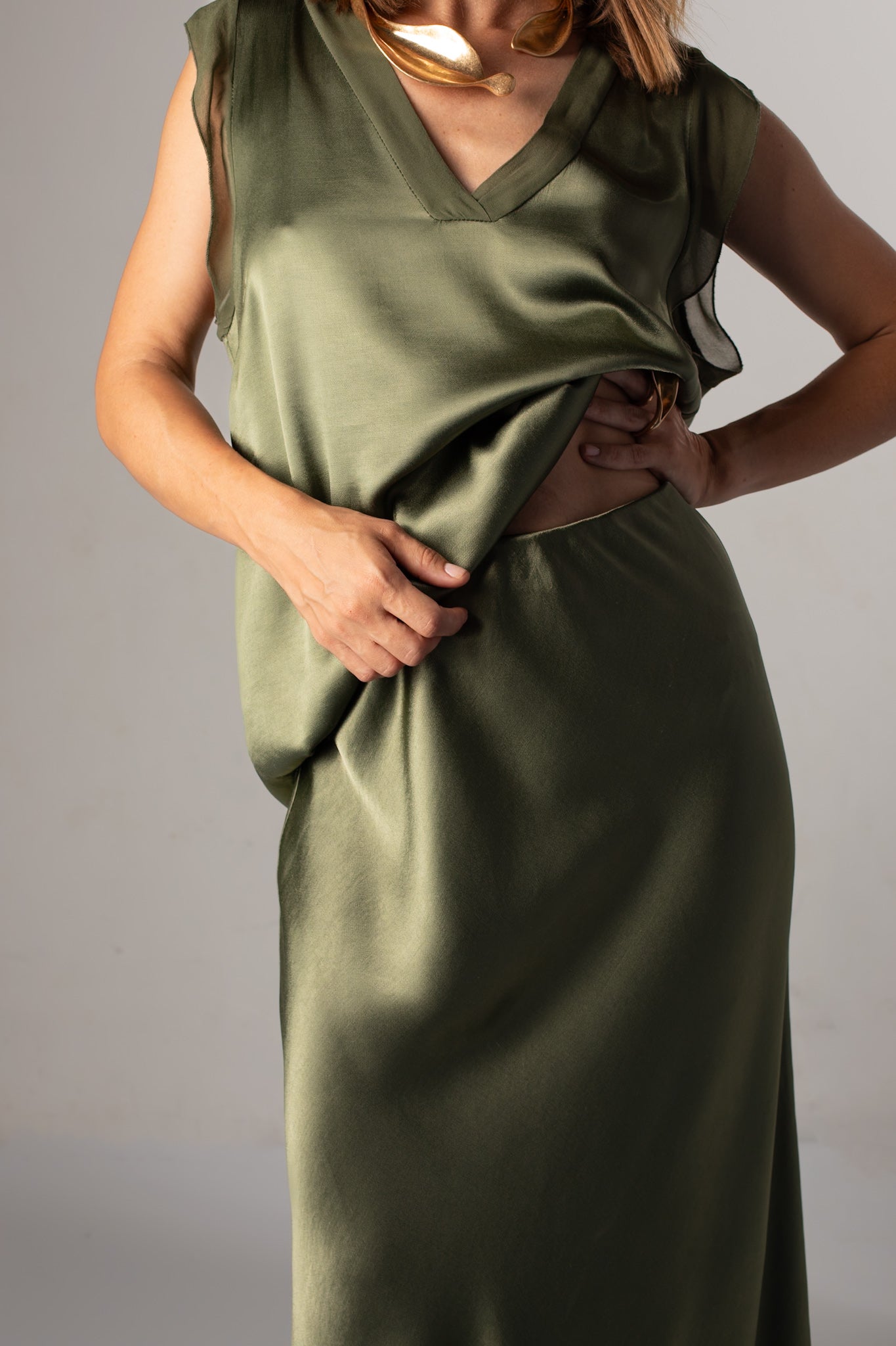 This bias-cut viscose skirt in a stunning pearl hue is the epitome of elegance. Designed to drape gracefully over your figure, it offers a flawless fit that accentuates your silhouette. The wide elastic waistband ensures both comfort and a secure fit, while the fabric's dense texture adds a touch of luxury, allowing the skirt to flow beautifully with every movement. Perfect for both day and evening looks, this skirt is a timeless addition to your wardrobe.