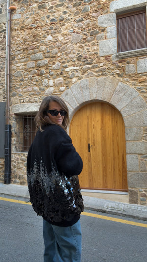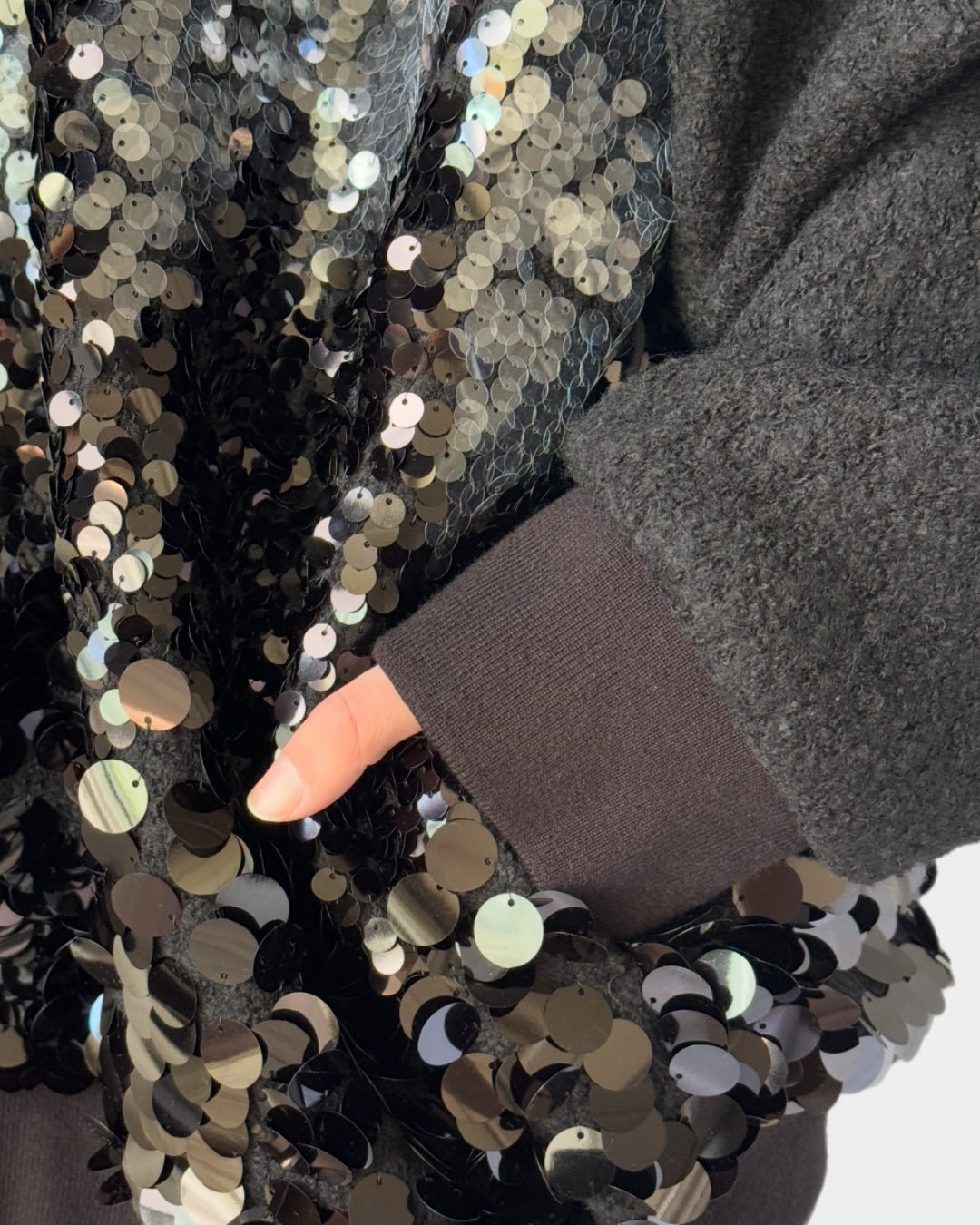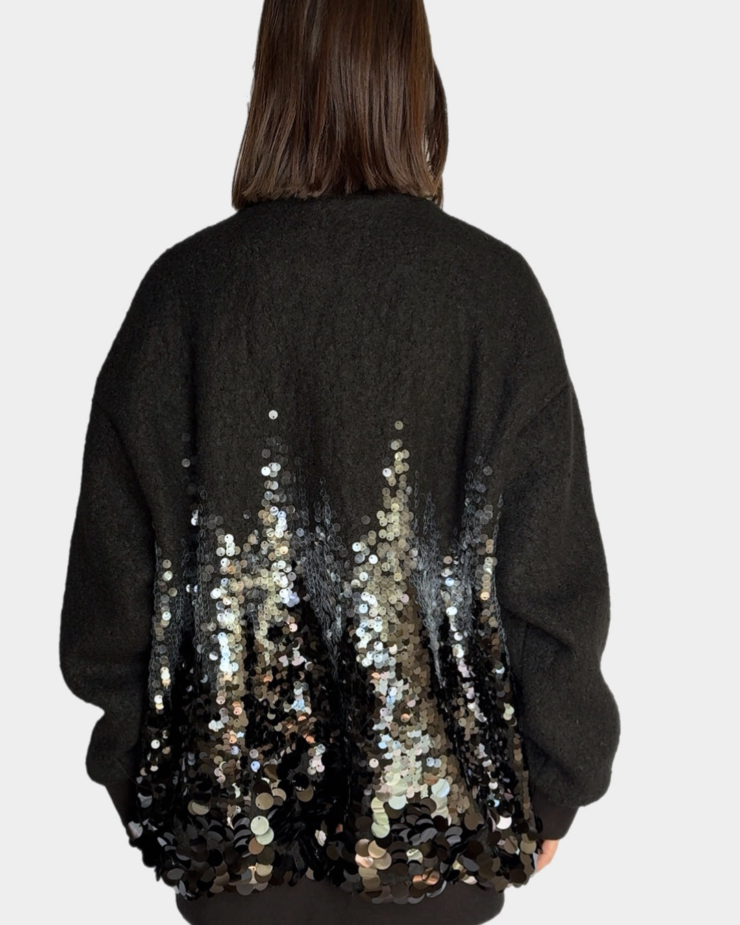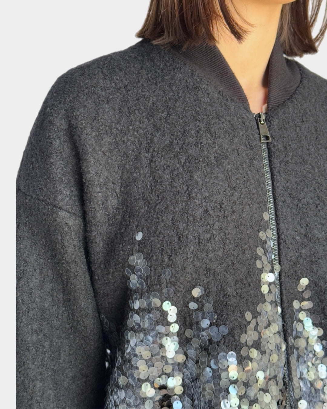 This oversized wool bomber is perfect for adding a bit of flair to your everyday look. With its elongated cut and zip-up closure, it's effortlessly cool and comfortable. The sequin detailing is what makes it special—a subtle yet striking design that doesn't overdo it. It’s just the right mix of chic and casual, making it easy to pair with anything, whether for a coffee run or a night out.
