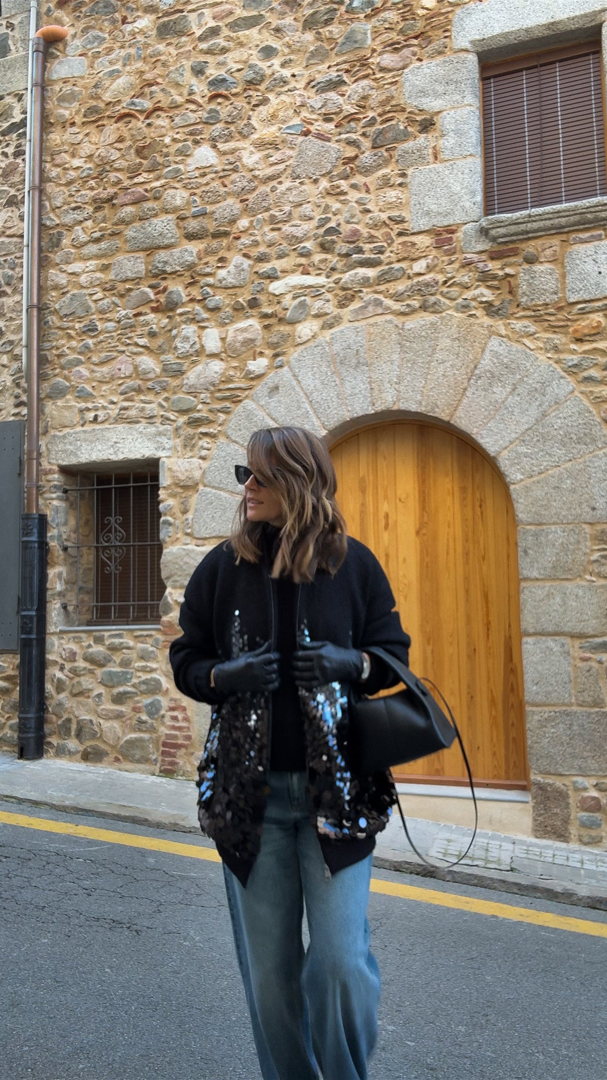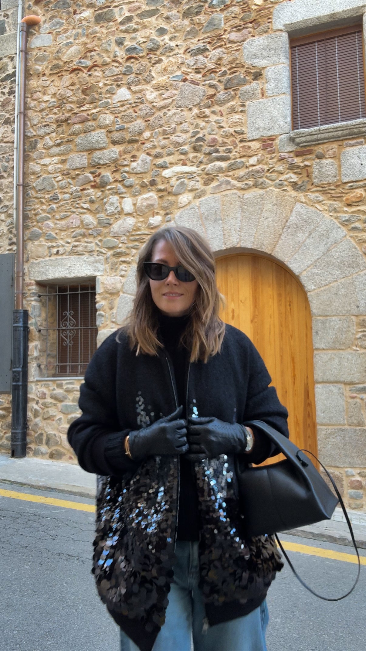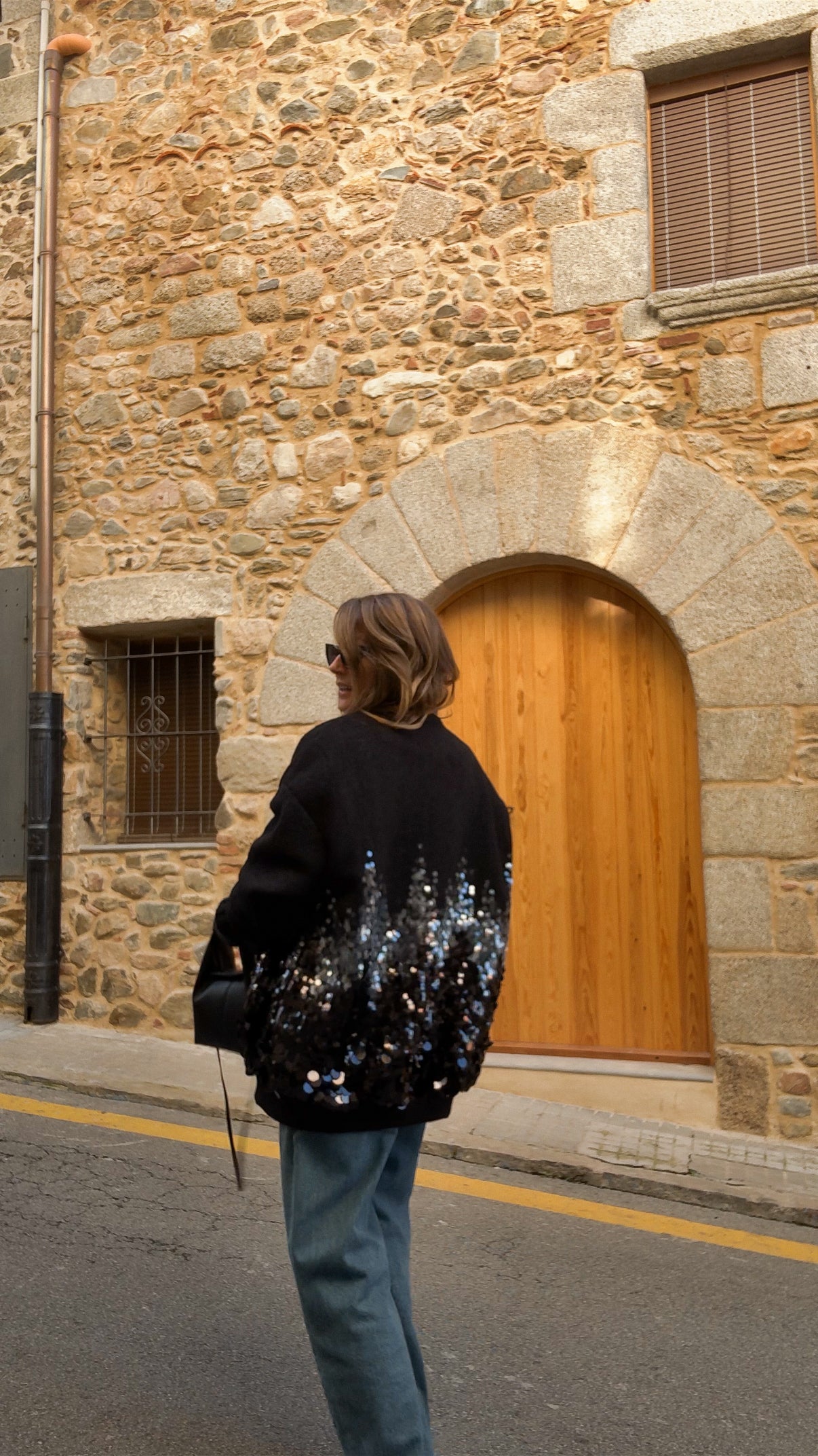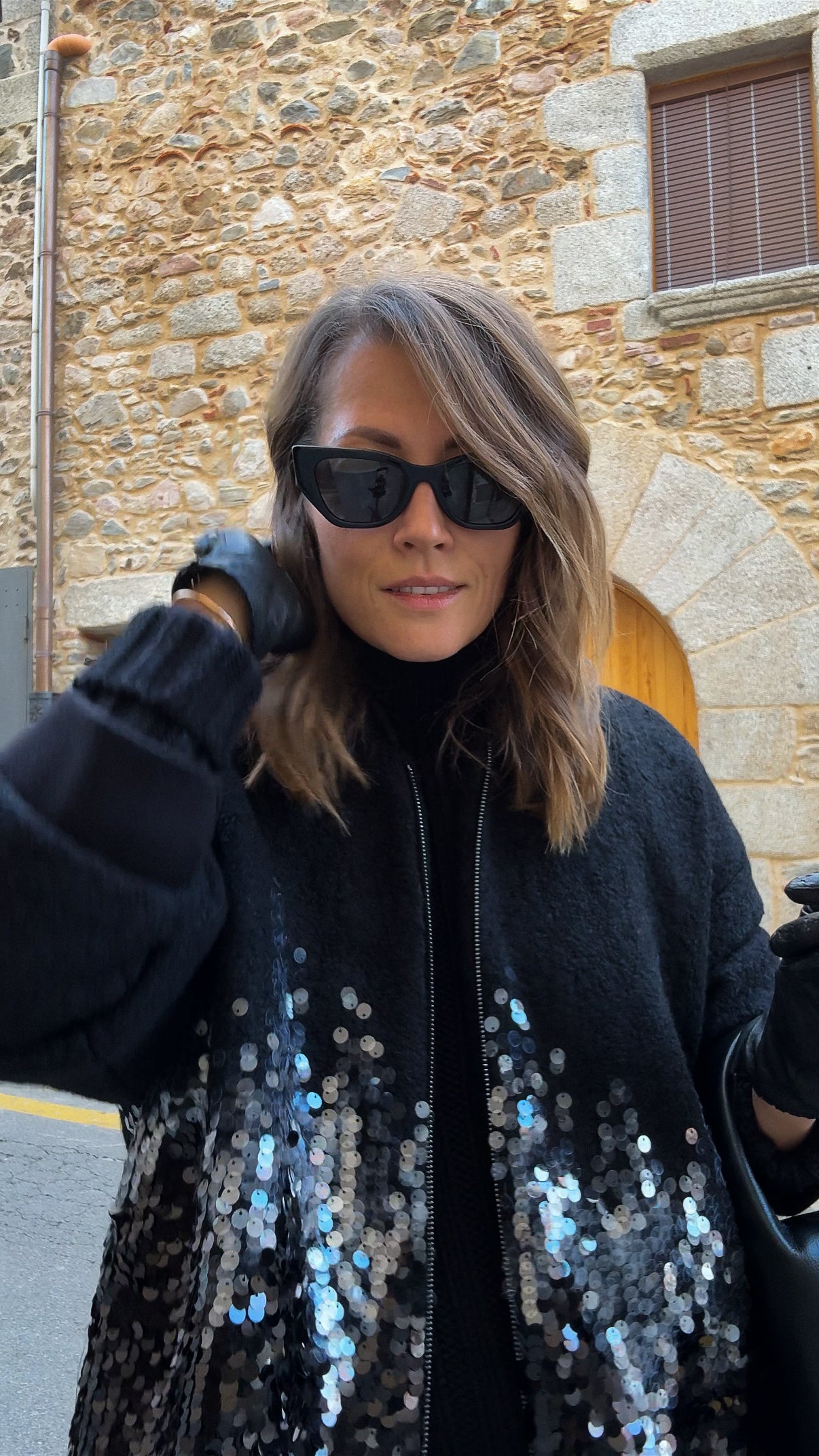 This oversized wool bomber is perfect for adding a bit of flair to your everyday look. With its elongated cut and zip-up closure, it's effortlessly cool and comfortable. The sequin detailing is what makes it special—a subtle yet striking design that doesn't overdo it. It’s just the right mix of chic and casual, making it easy to pair with anything, whether for a coffee run or a night out.