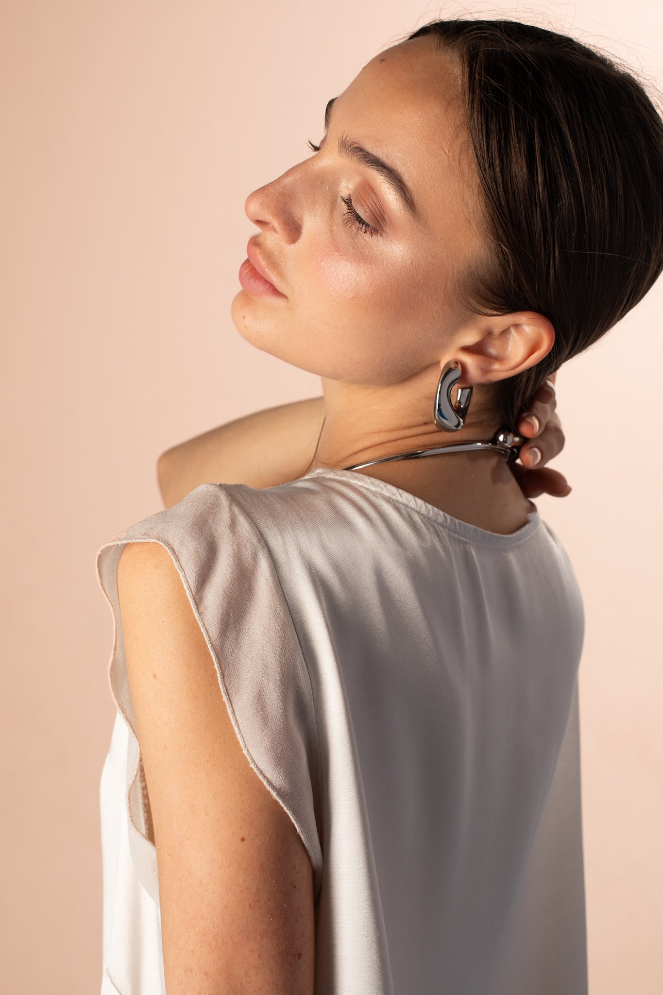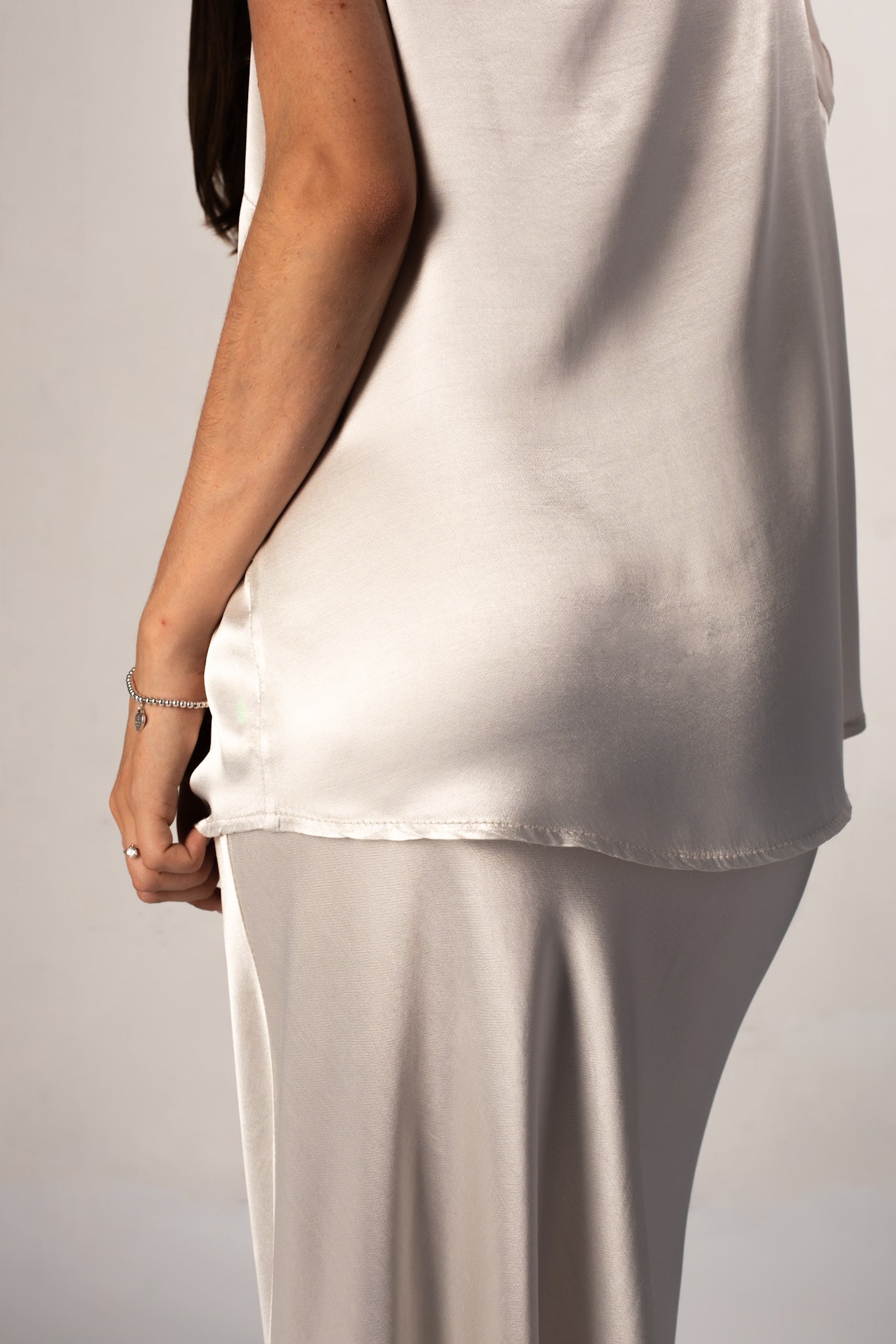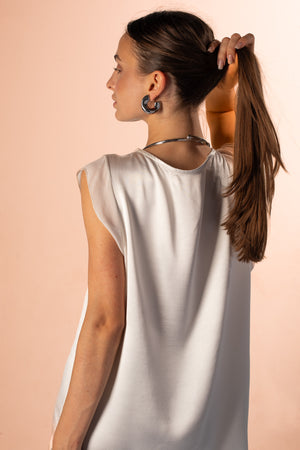 This pearl viscose top features a fluid, lightweight design that drapes beautifully over the body, creating an elegant and relaxed silhouette. The deep V-neckline is framed by wide, overlapping bands of fabric, adding a subtle yet sophisticated detail to the top. The sleeves are delicately capped, with a slight sheerness that complements the soft sheen of the viscose. The top's minimalist design makes it a versatile piece that can be easily dressed up or down, perfect for pairing with high-waisted skirts or your favorite jeans for an effortlessly chic look.