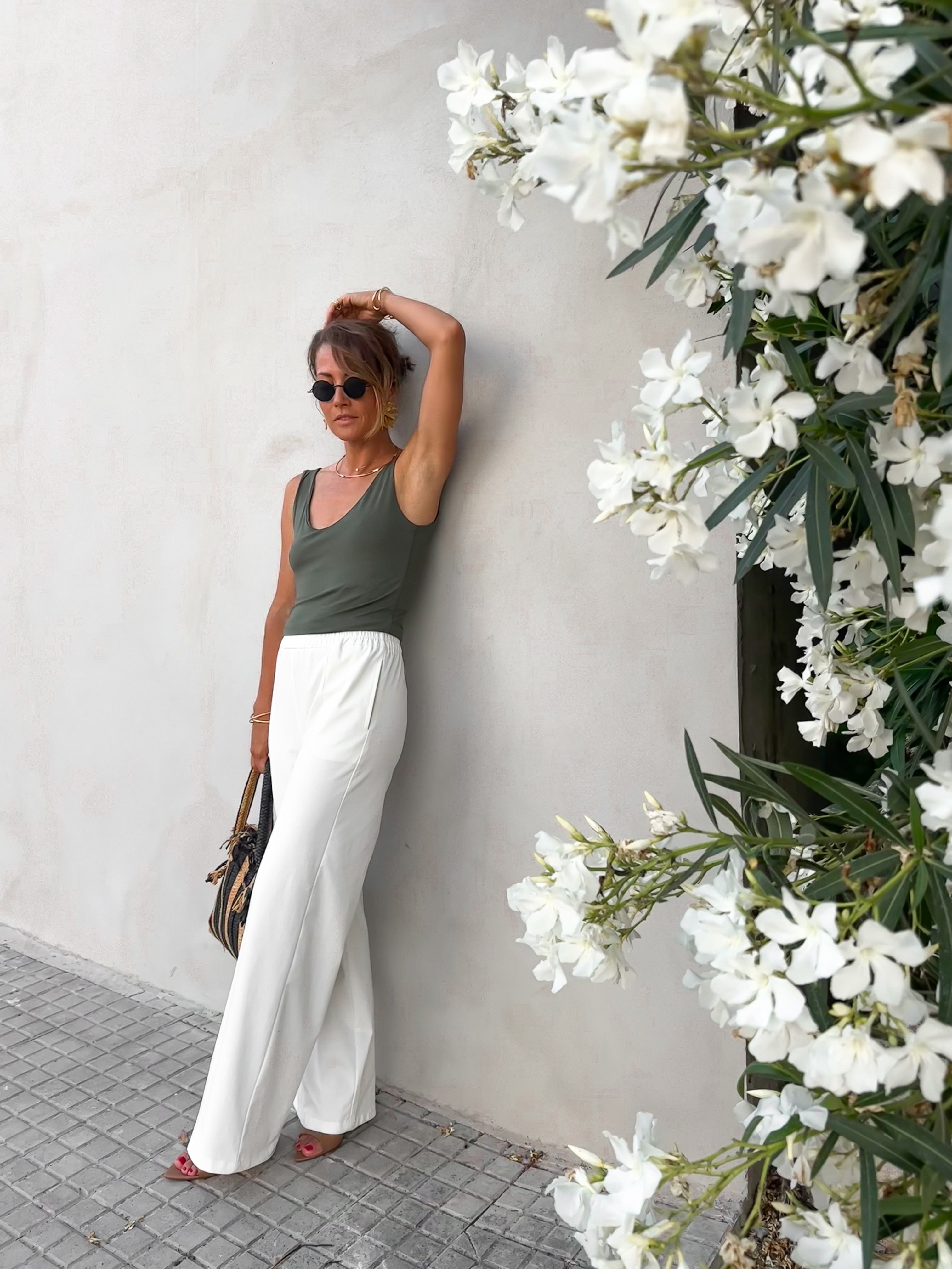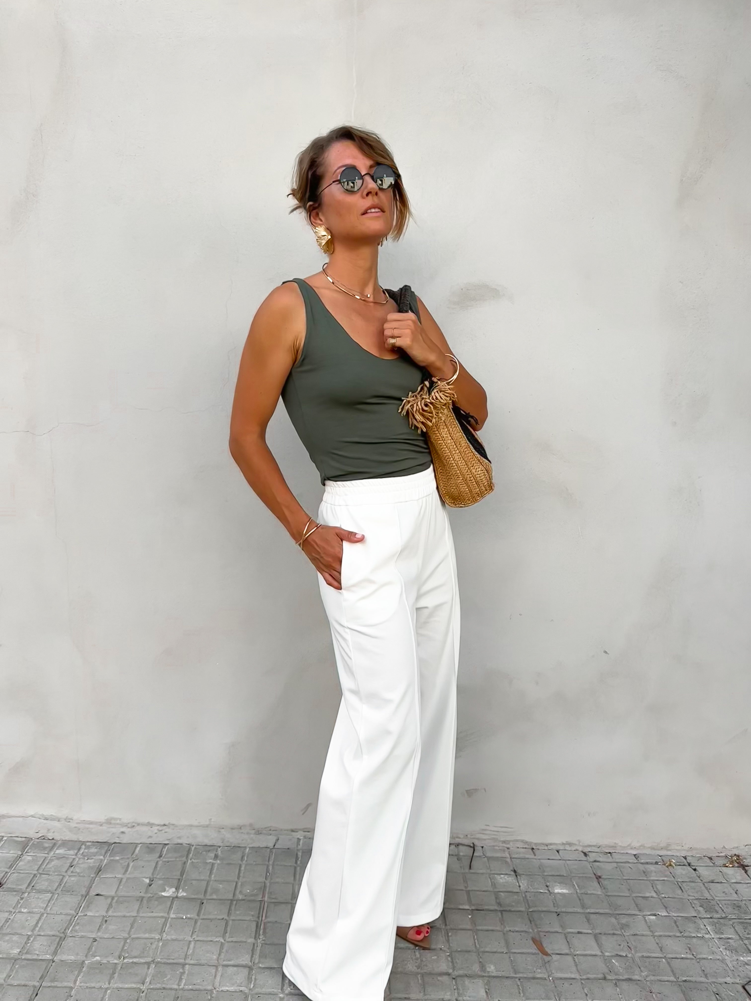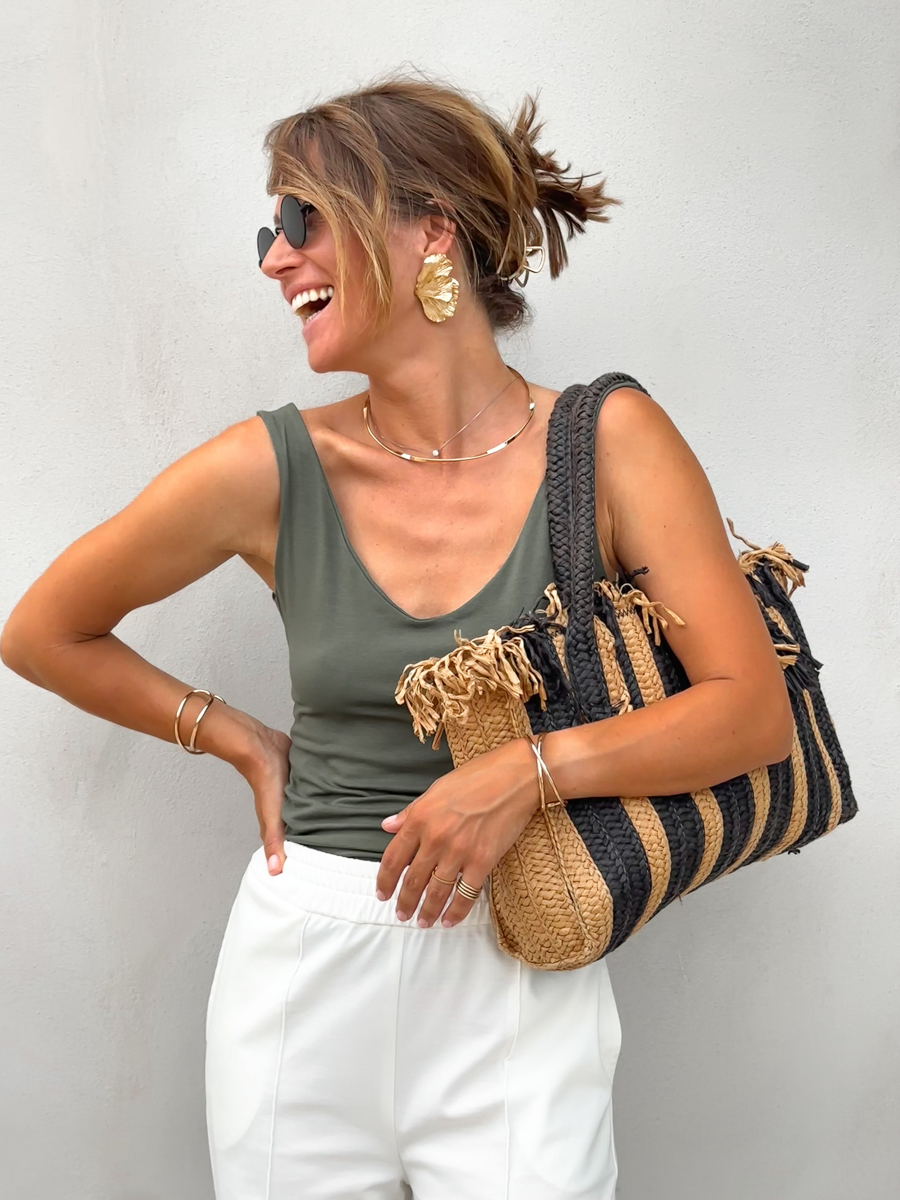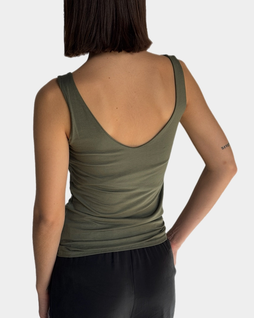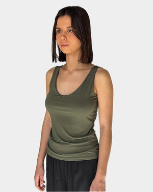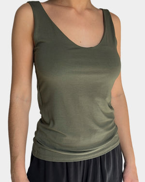 Viscose tank top in a rich olive hue, features a double-layered fabric at the bust area, ensuring coverage and a perfect fit. The stretchy material contours to your shape, creating a flattering silhouette. Ideal for layering or wearing on its own, this piece is a must-have addition to your wardrobe.