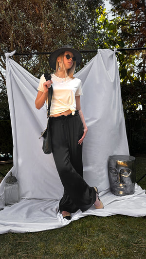 This Tencel t-shirt with a relaxed, free-flowing silhouette is the perfect choice for those who value both comfort and style. Crafted in a warm white hue with contrasting dark brown stitching along the edges, it adds a touch of character to the design. The fabric is incredibly soft to the touch, ensuring maximum comfort throughout the day. This t-shirt is versatile in use: pair it with tailored trousers or a skirt for an elegant look, or with jeans or shorts for a casual, everyday style.