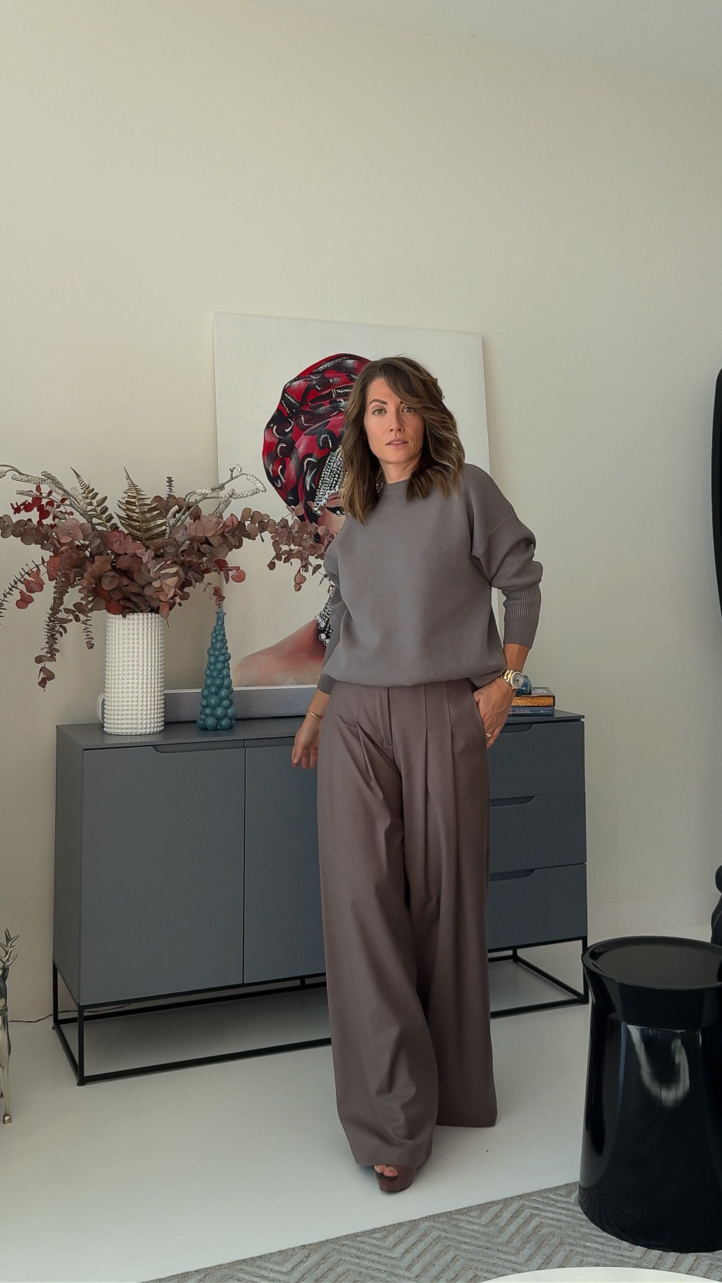 These wide palazzo trousers in a taupe shade are all about relaxed sophistication. They feature a high waist, with gentle pleats in the front that add a chic detail to the silhouette. Made of breathable material, they're perfect for staying comfortable yet stylish all day long—ideal for pairing with anything from a casual tee to a more tailored top for a versatile look.