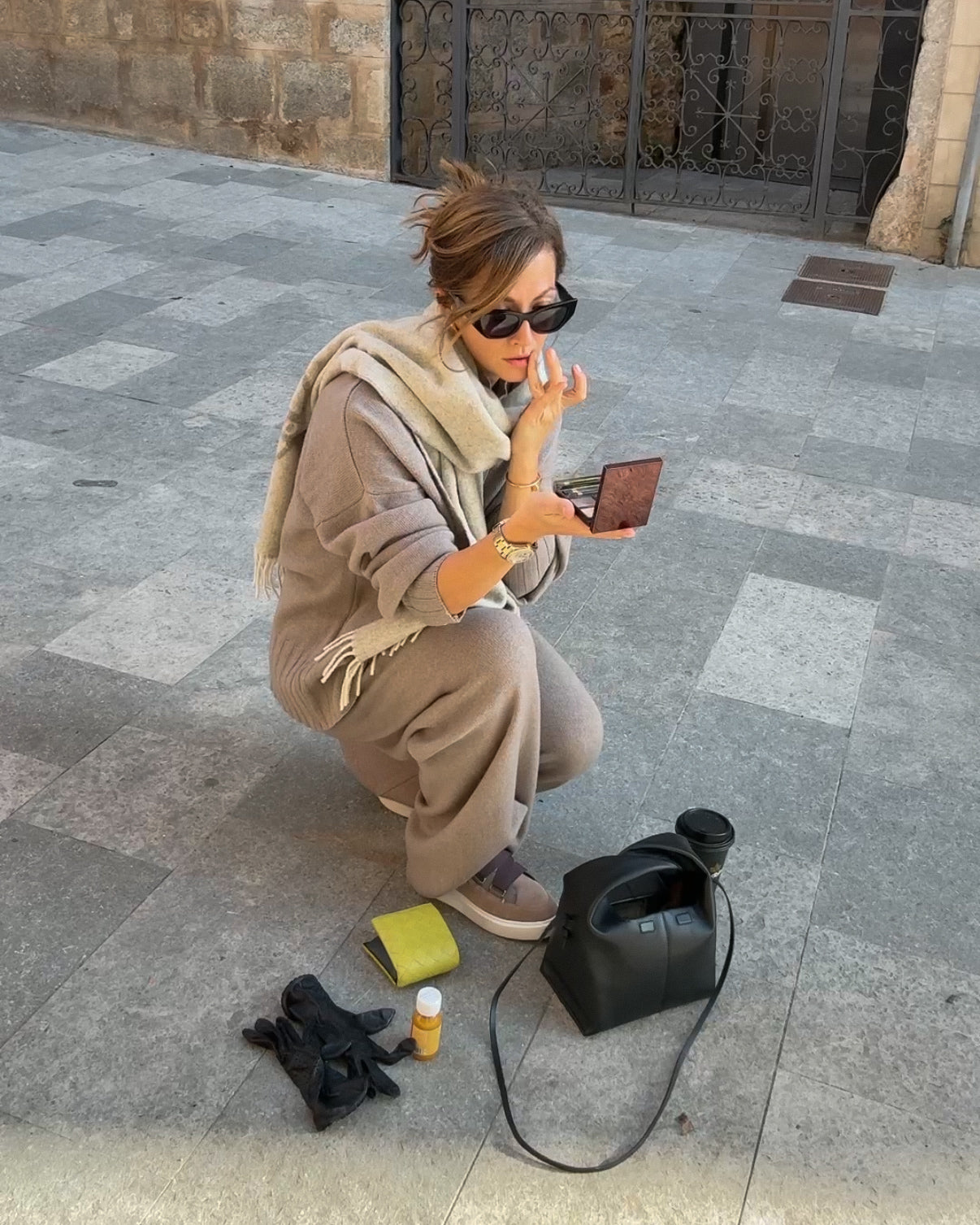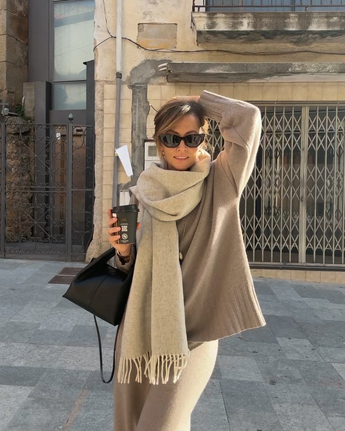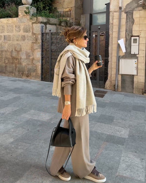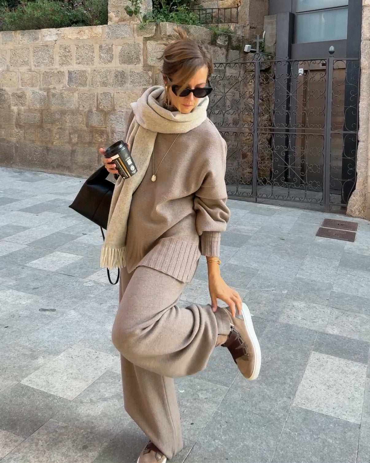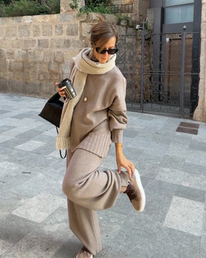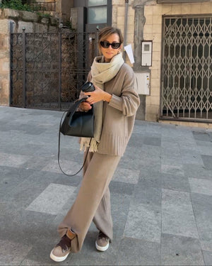 This cozy cashmere and wool blend set is the ultimate combination of comfort and elegance. The sweater, with its relaxed fit and soft texture, pairs perfectly with the wide-leg trousers featuring a wide, gentle elastic waistband for all-day ease. Ideal for lounging or stepping out in effortless style, this set feels like a warm hug and looks chic without trying too hard. Perfect for those cooler days when you want to feel both comfortable and stylish.