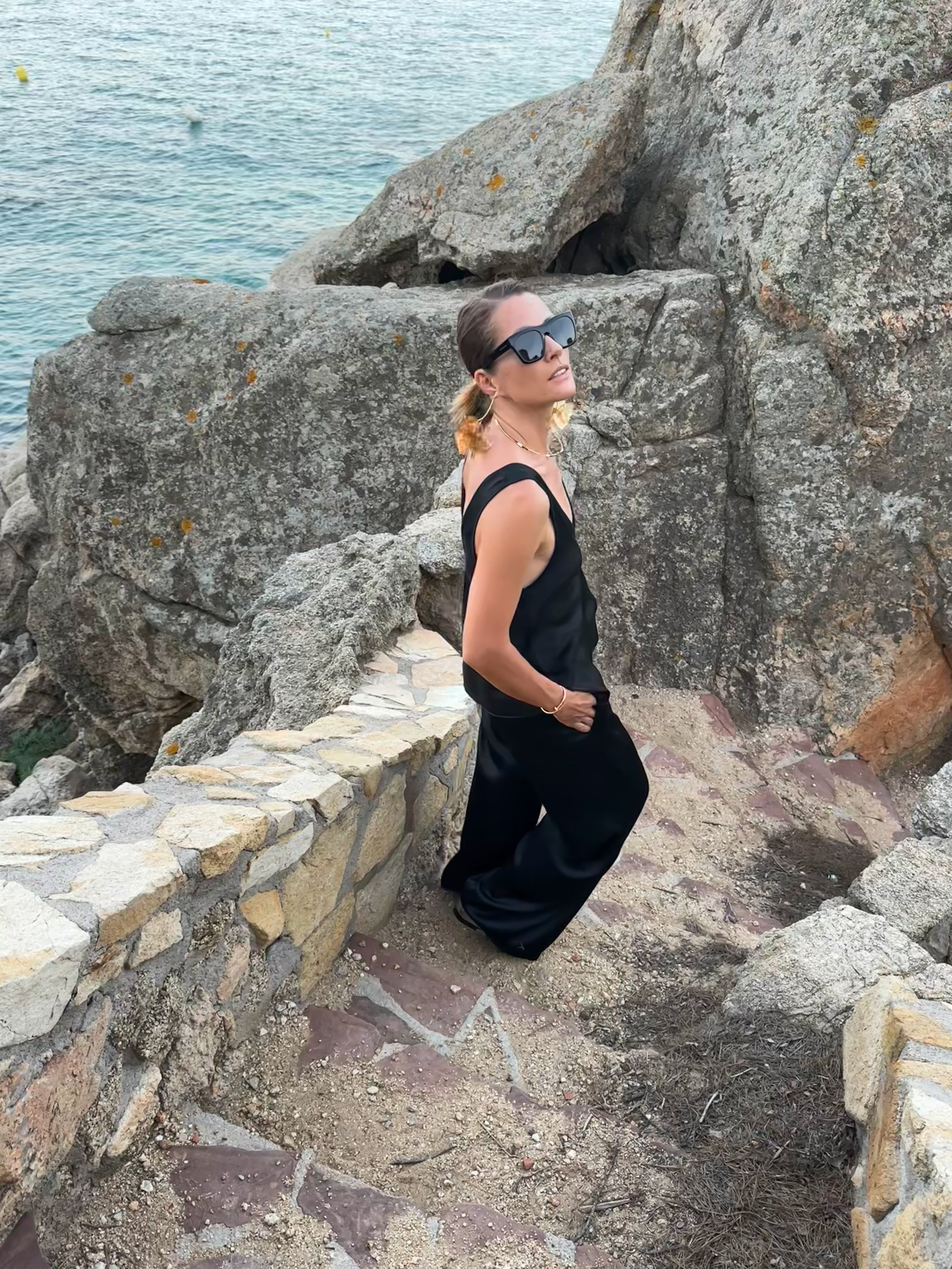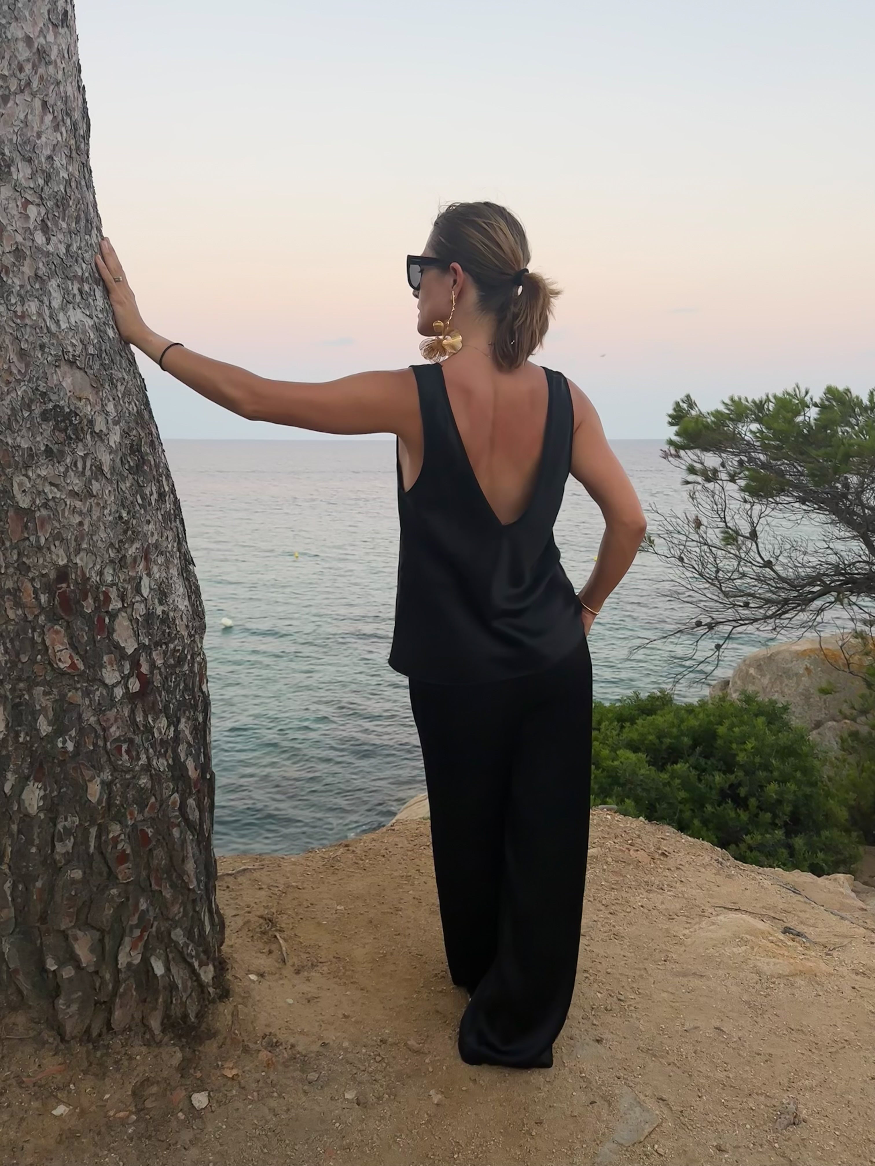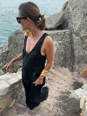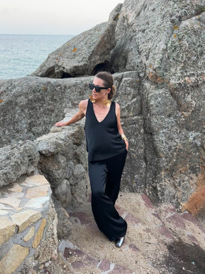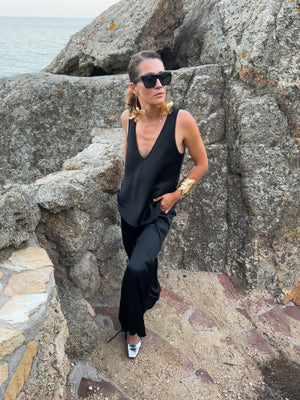 This viscose top designed with a flattering deep V-neckline at the front and back, it beautifully accentuates the shoulders and neckline. The soft, silky fabric drapes gracefully over the body, creating a relaxed yet refined silhouette. Perfect for warm weather or layering, this top can be dressed up with statement jewelry or paired down for a more casual look. Its minimalist design makes it a versatile piece that transitions seamlessly from day to night.
