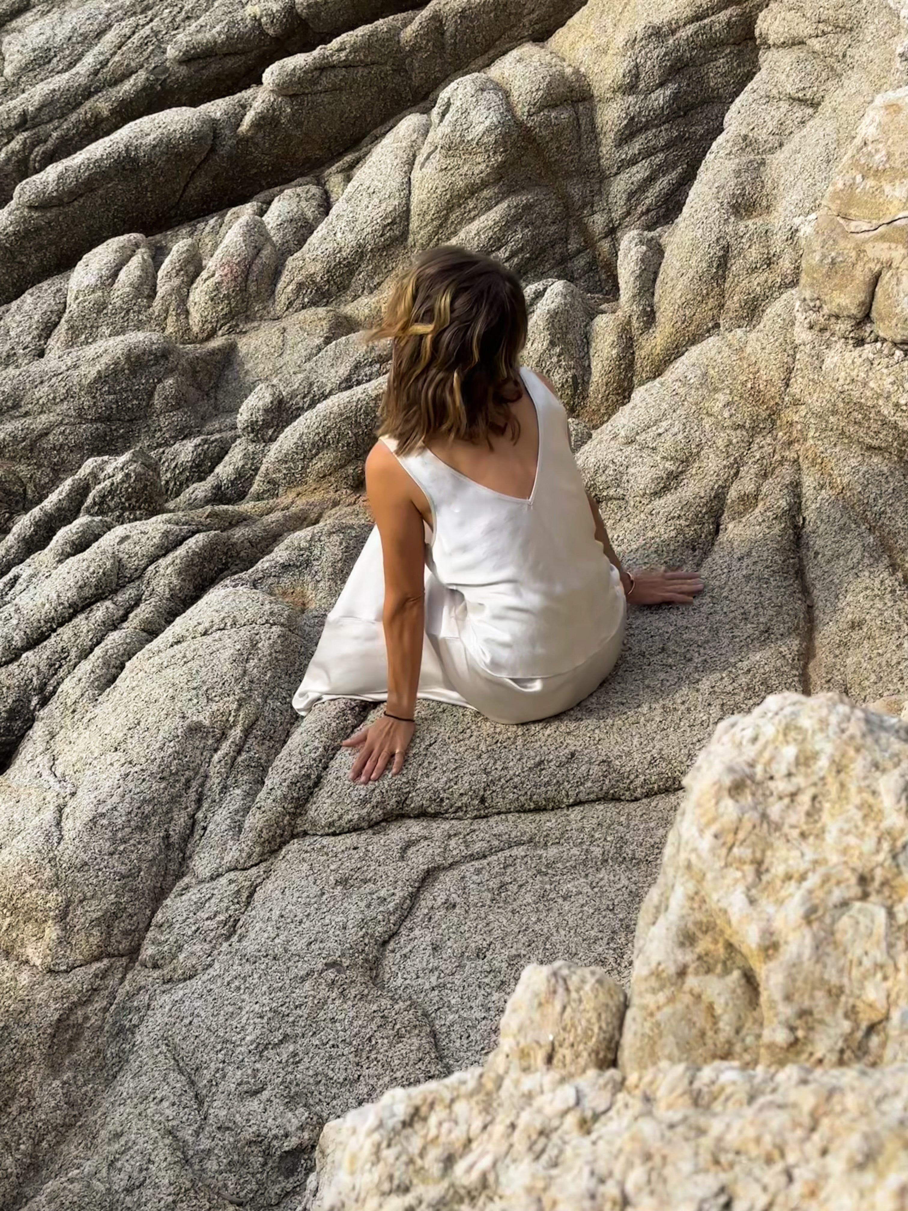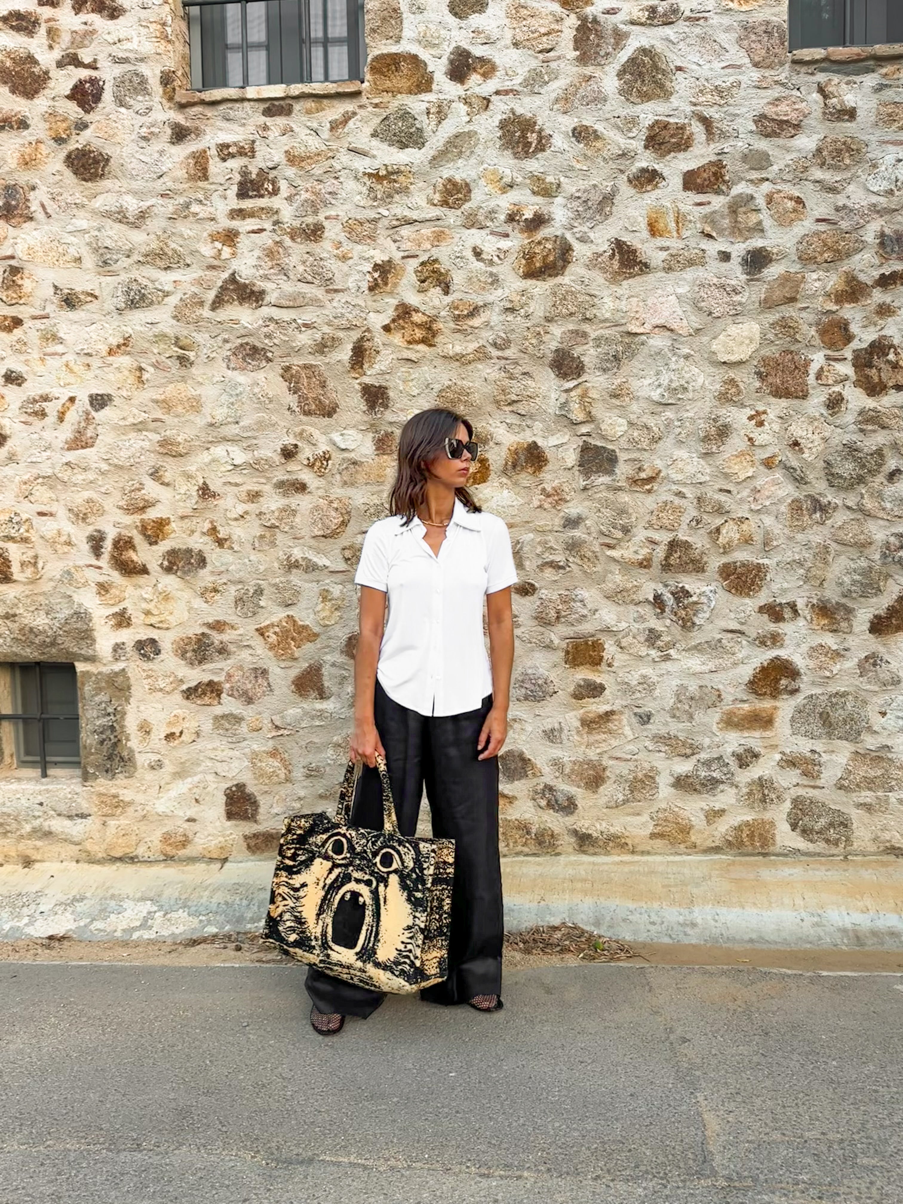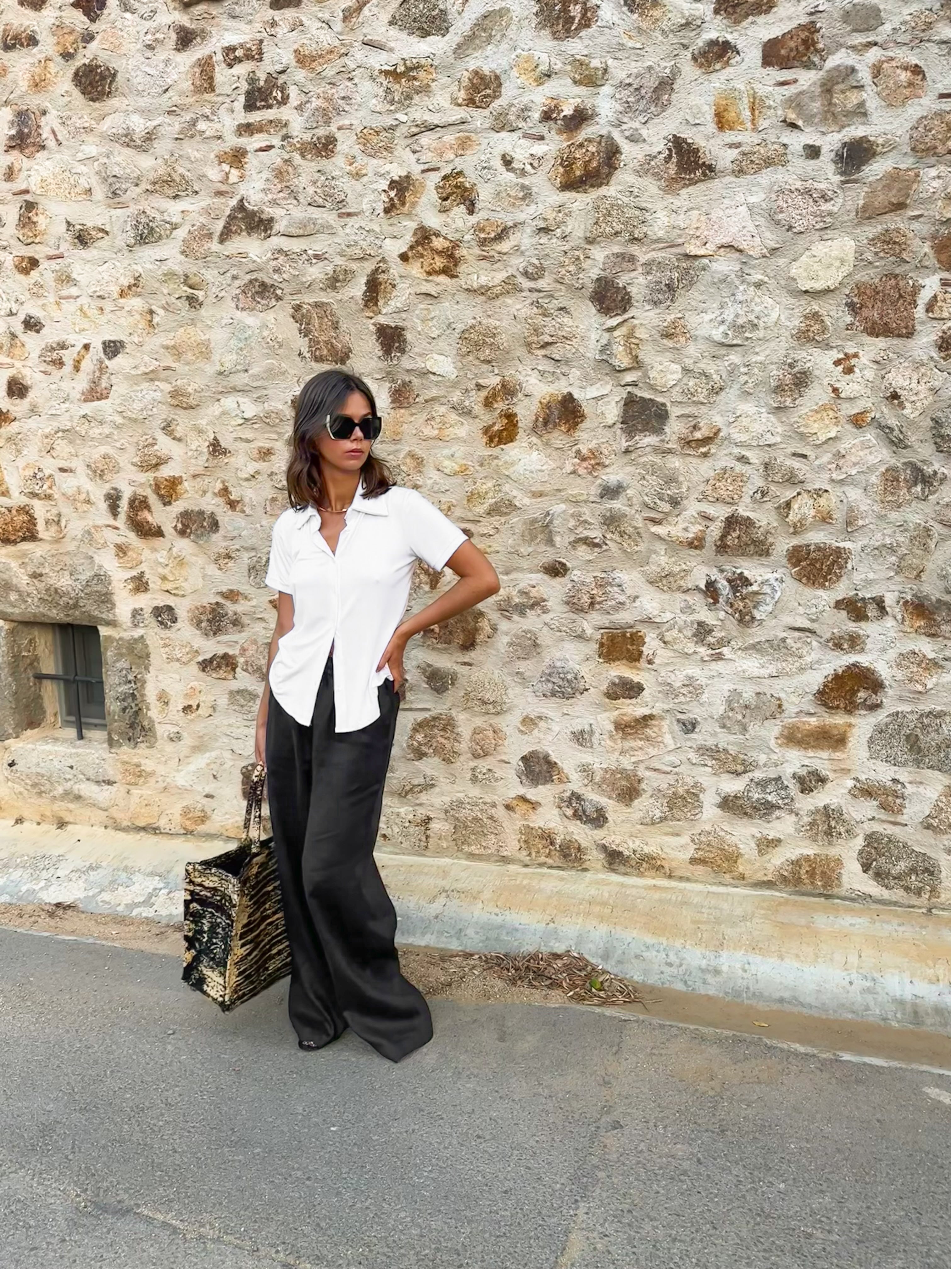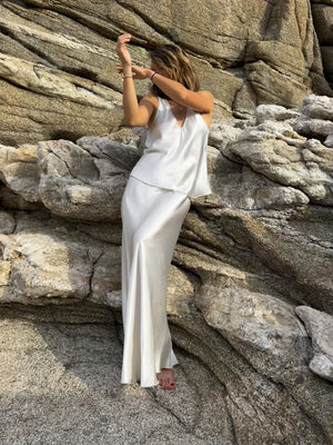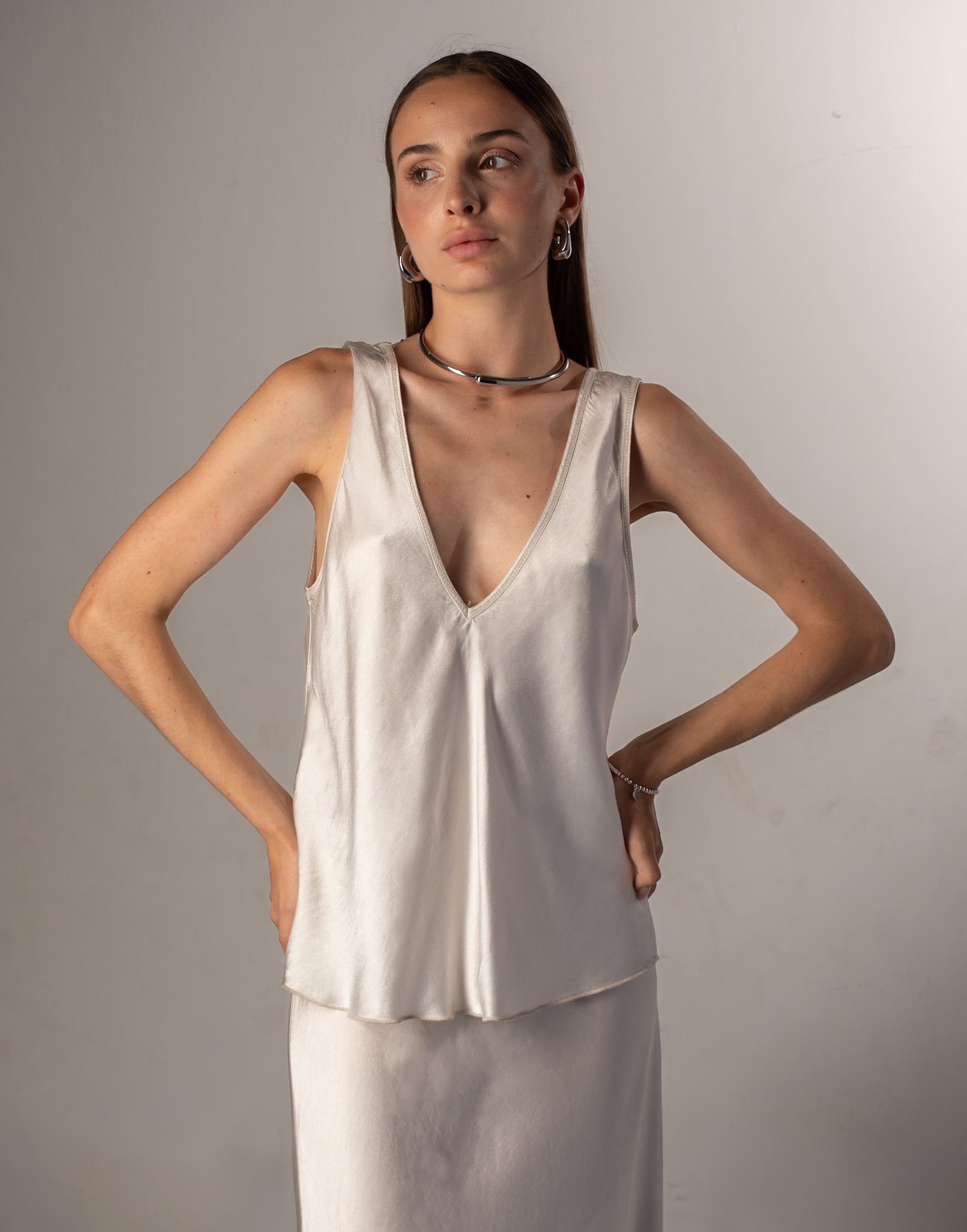 This viscose top designed with a flattering deep V-neckline at the front and back, it beautifully accentuates the shoulders and neckline. The soft, silky fabric drapes gracefully over the body, creating a relaxed yet refined silhouette. Perfect for warm weather or layering, this top can be dressed up with statement jewelry or paired down for a more casual look. Its minimalist design makes it a versatile piece that transitions seamlessly from day to night.