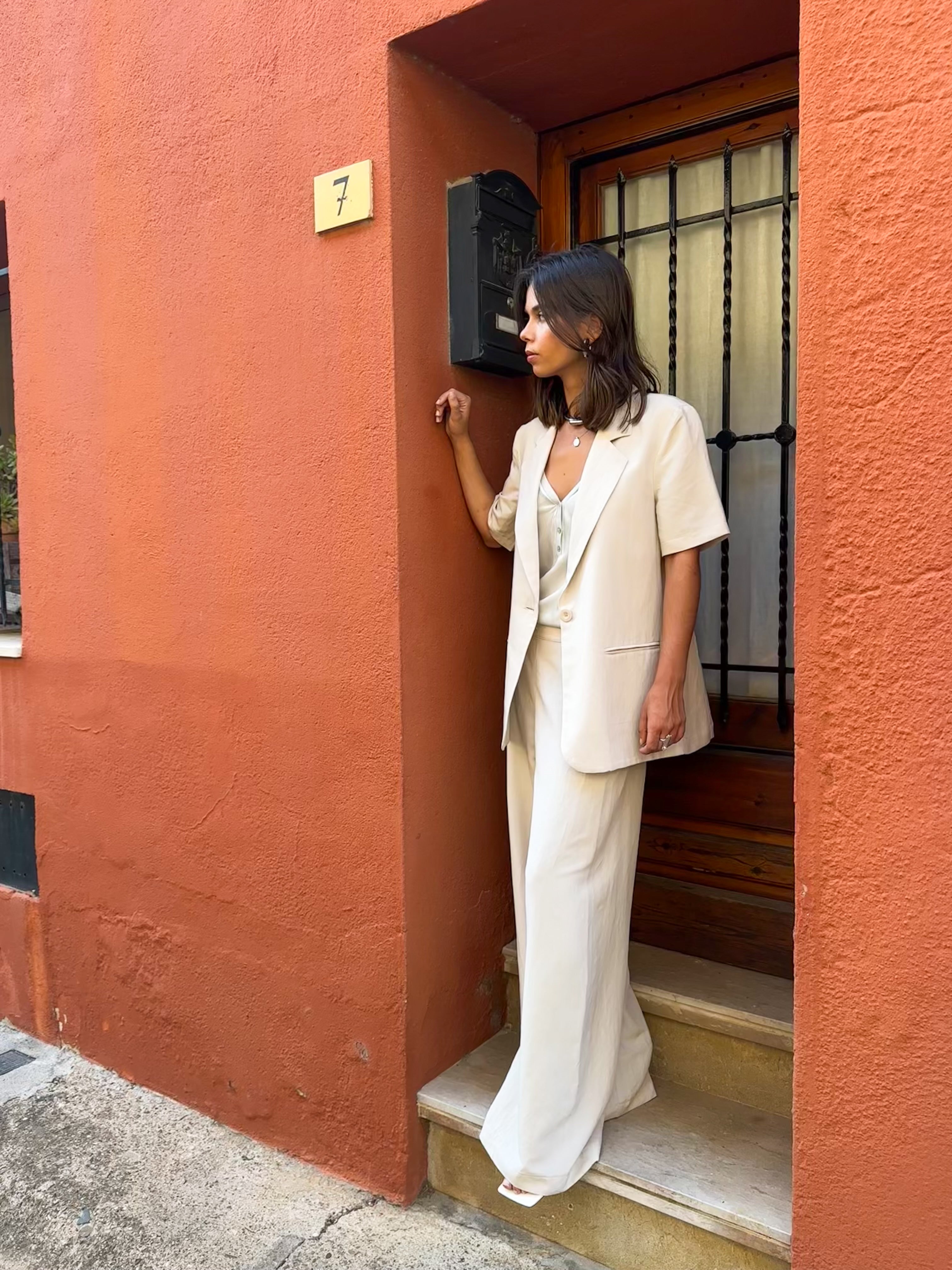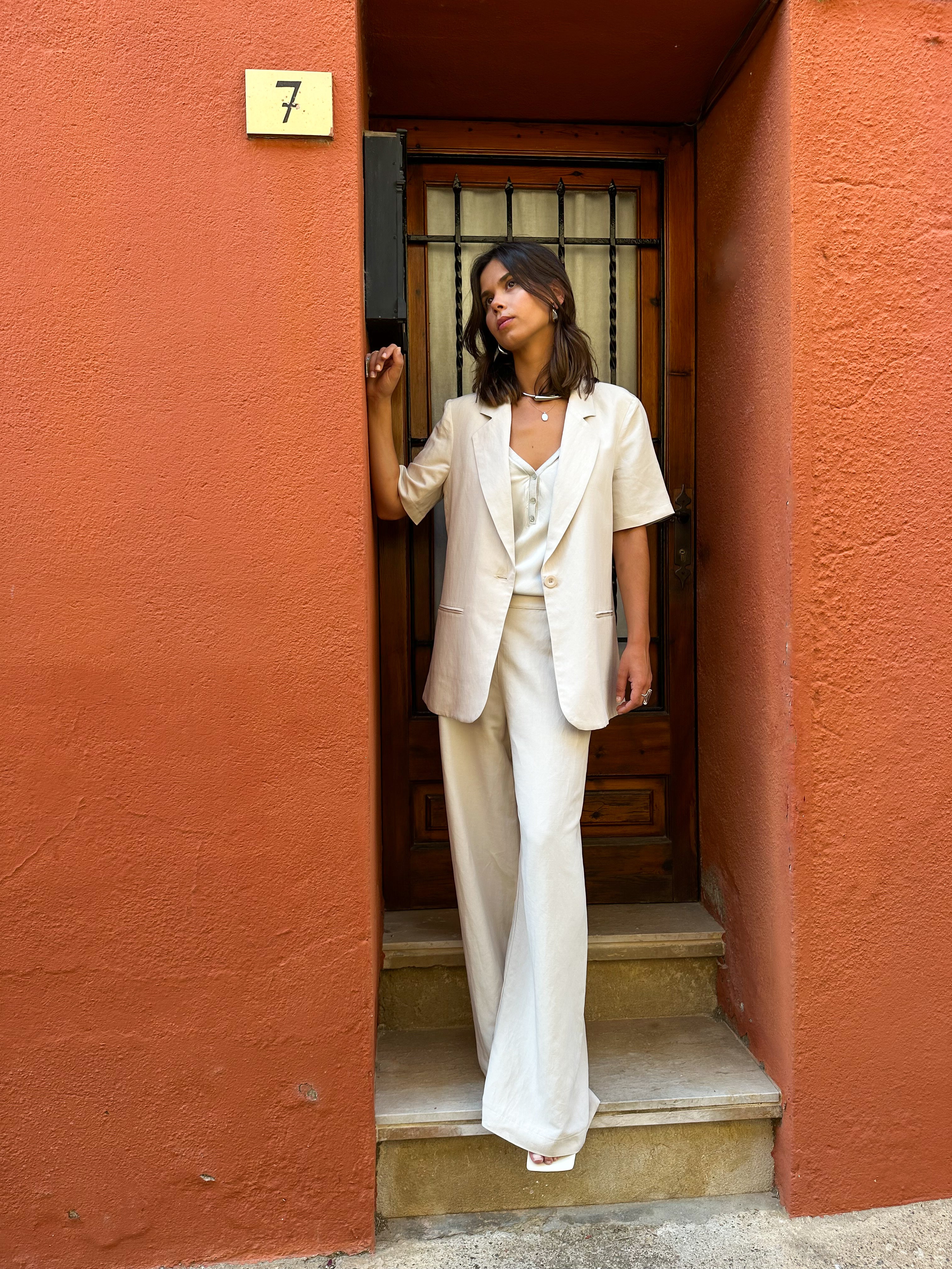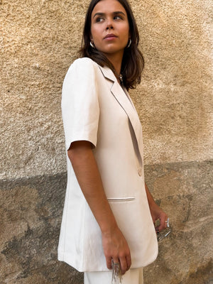This sophisticated blazer made from a luxurious blend of linen and viscose, perfect for those warm days when you need to look effortlessly chic. The blazer features a single button closure and elegantly cropped sleeves, adding a modern touch to a classic silhouette.